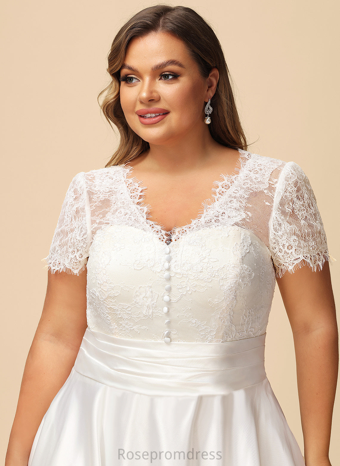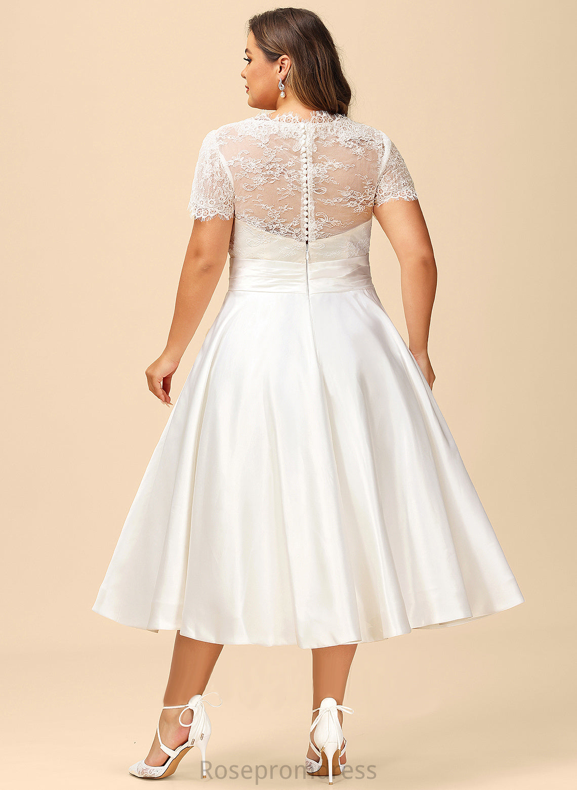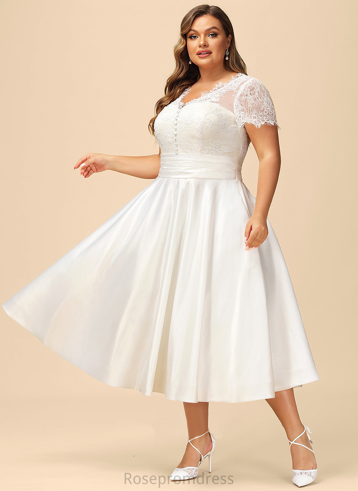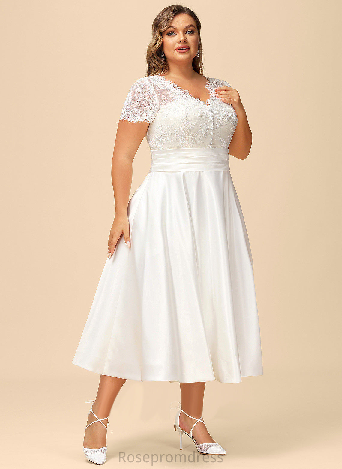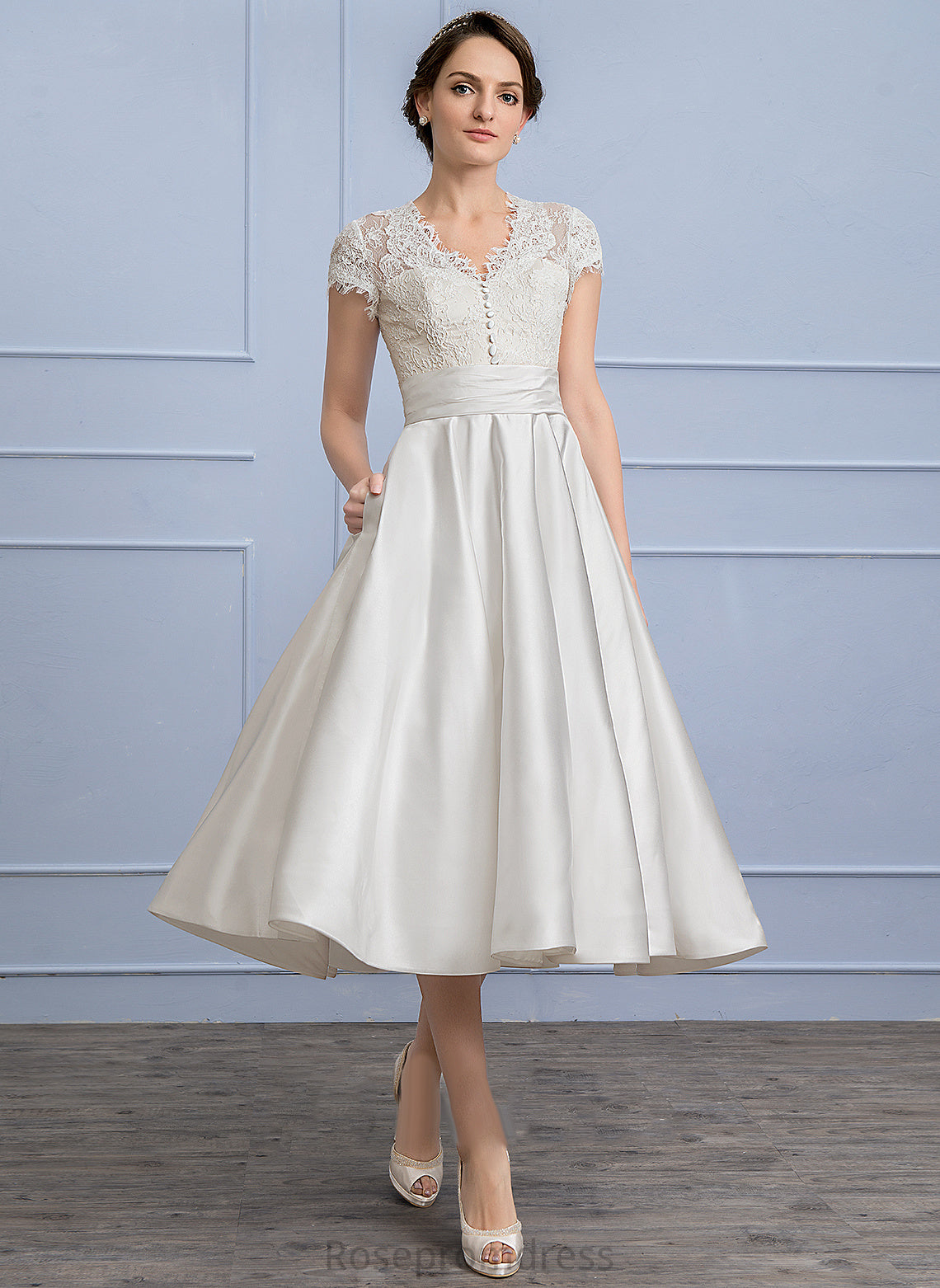Ruffle A-Line Tea-Length Wedding Dresses Dress With Satin Wedding V-neck Lace Annalise