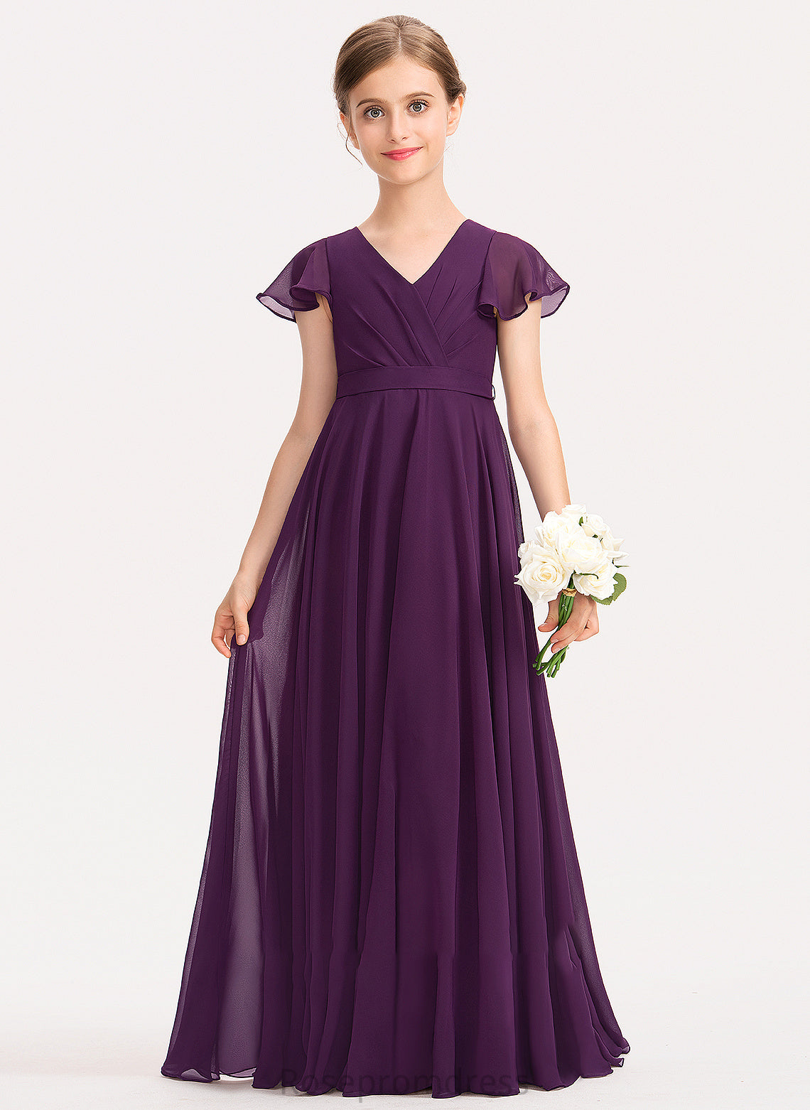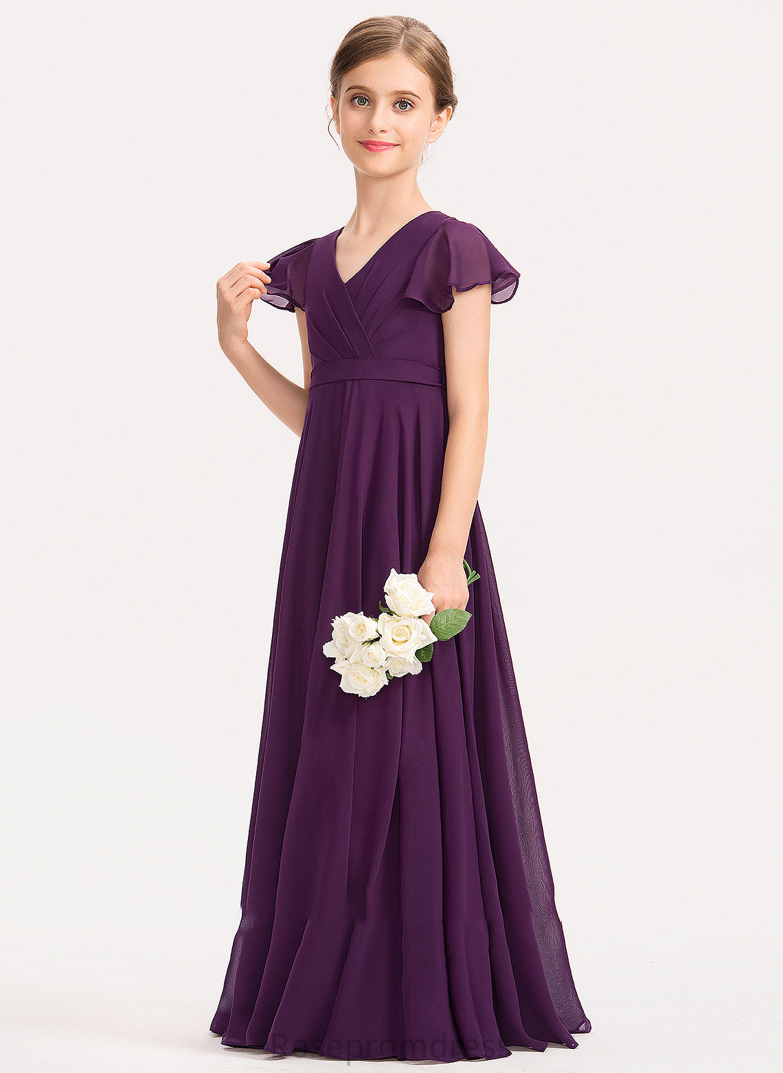 Ruffles With Floor-Length Chiffon Cascading Alia A-Line Junior Bridesmaid Dresses V-neck Bow(s)