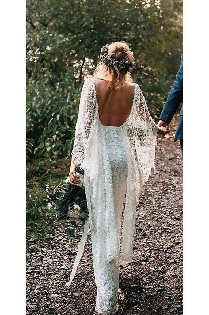Rustic Batwing Sleeve Lace Ivory Wedding Dresses Ivory Sheath Boho Wedding Dresses W1059