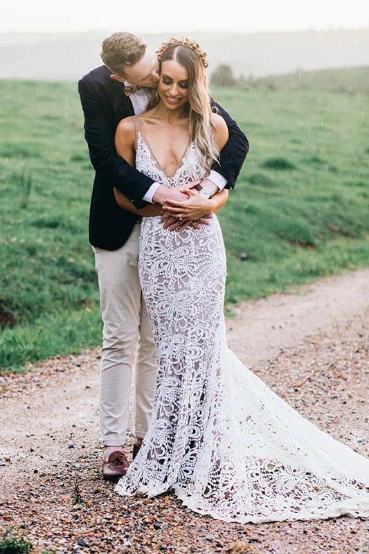 Rustic Lace Appliques V Neck Mermaid Wedding Dresses, Long Bridal Dresses SRS15527