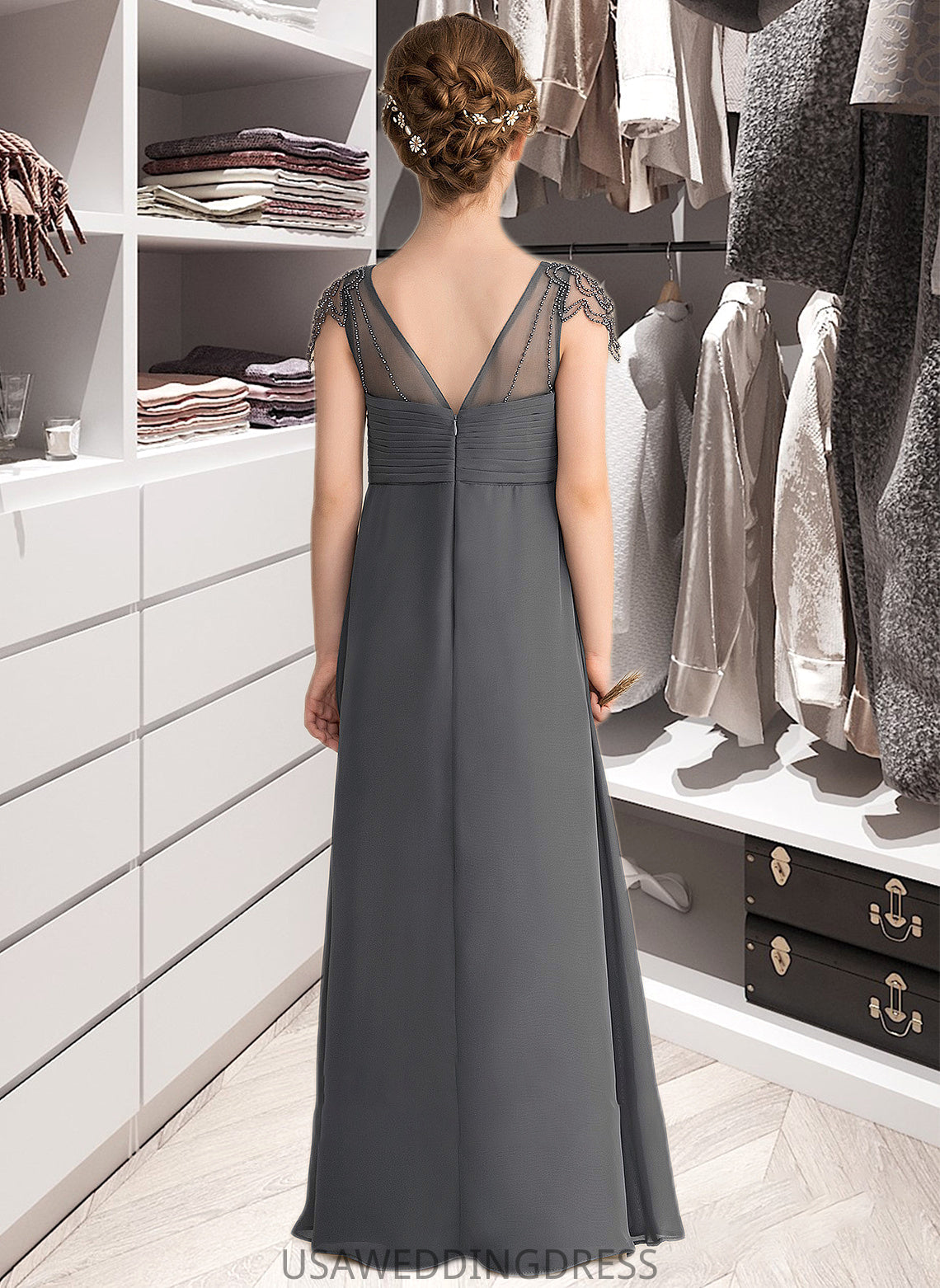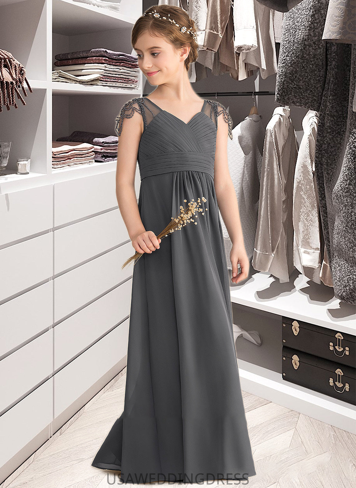 Sanaa A-Line V-neck Floor-Length Chiffon Junior Bridesmaid Dress With Ruffle Beading DSP0013653