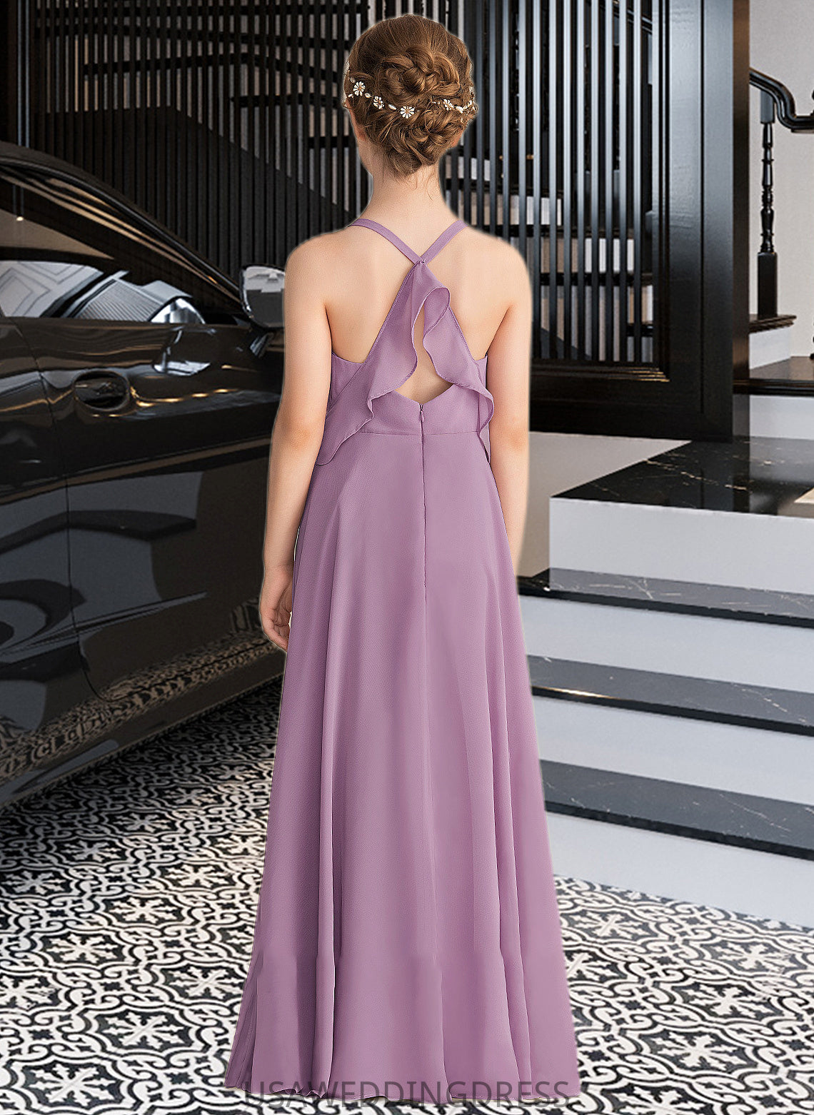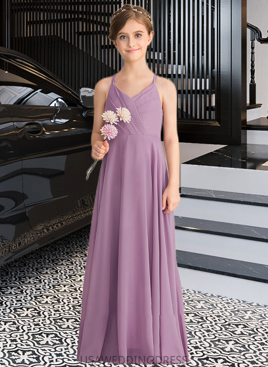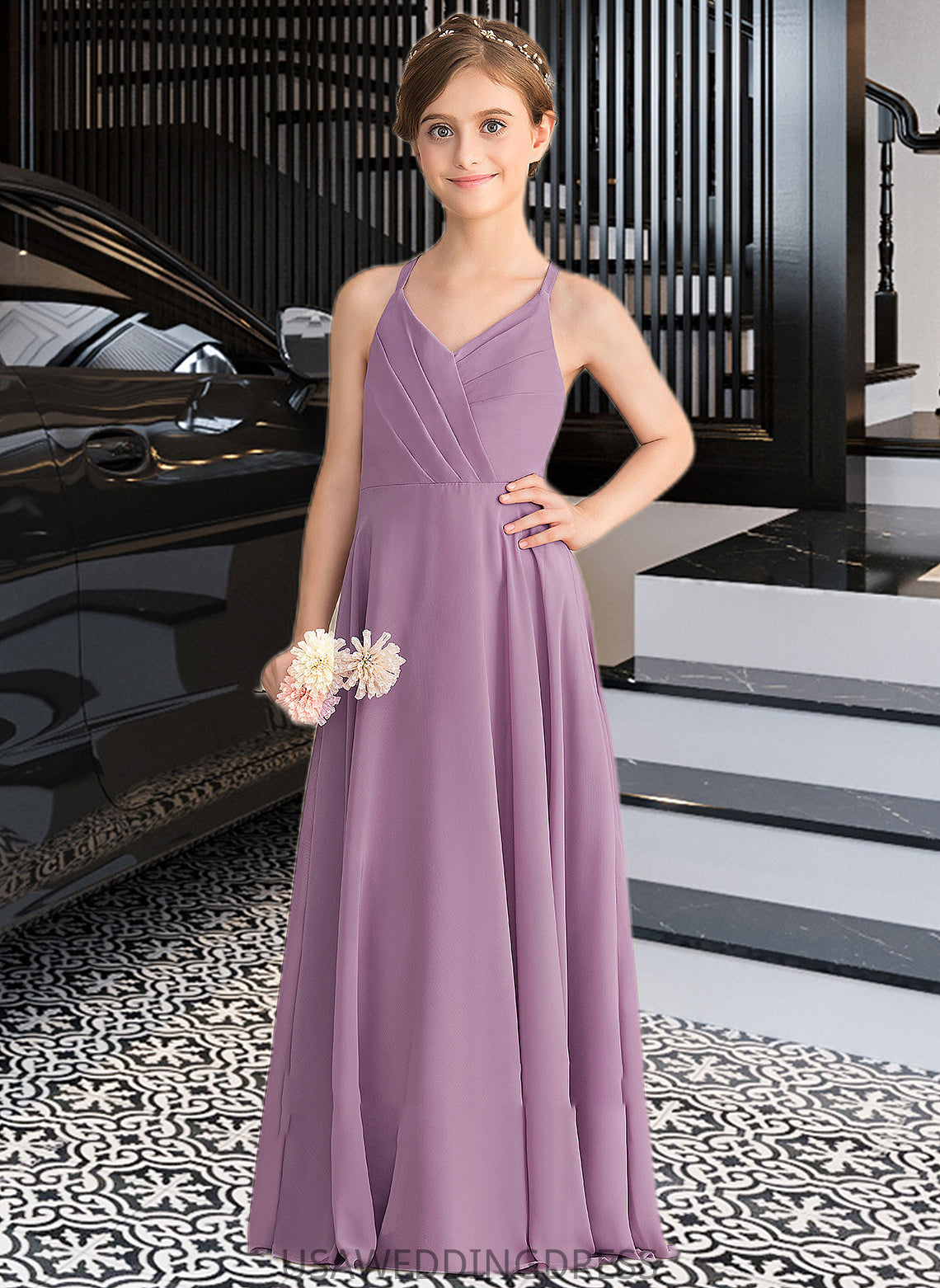 Savanna A-Line V-neck Floor-Length Chiffon Junior Bridesmaid Dress With Cascading Ruffles DSP0013644