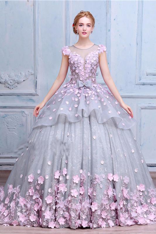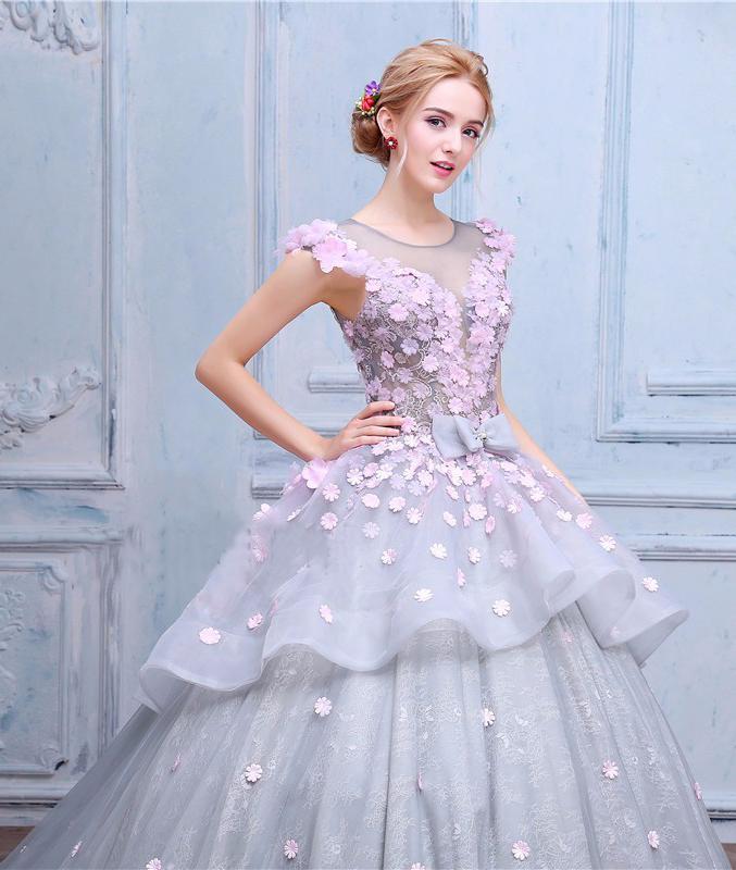 Scoop Ball Gown Gray Tulle Sleeveless Bowknot Empire Waist Wedding Dress with Pink Flowers RS576