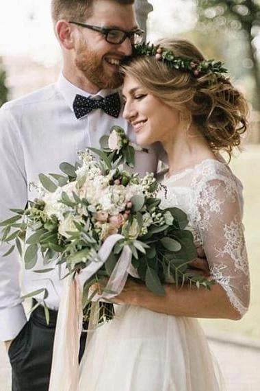 See Through Half Sleeve Ivory Country Wedding Dresses Backless Tulle Wedding Dress W1073
