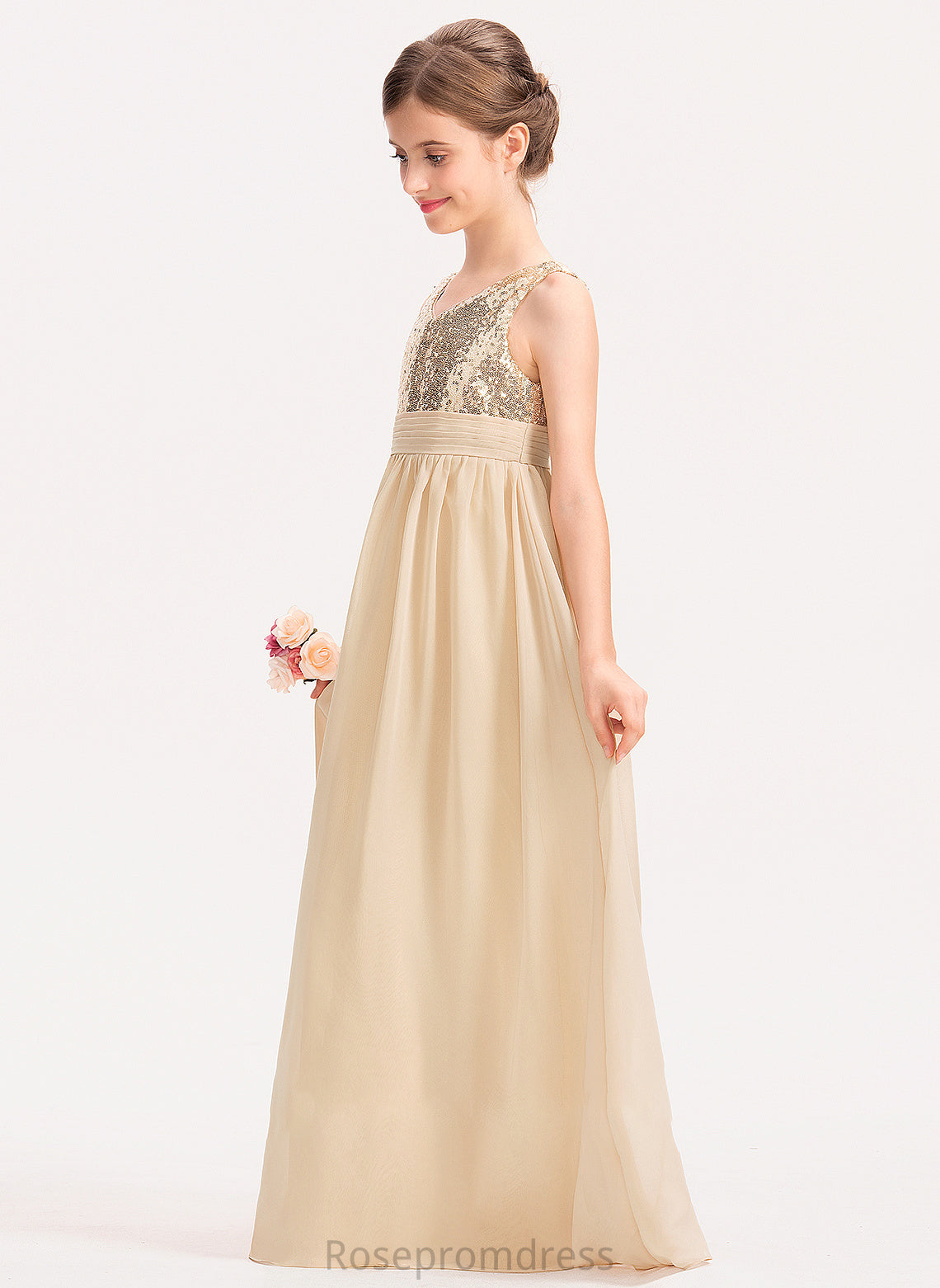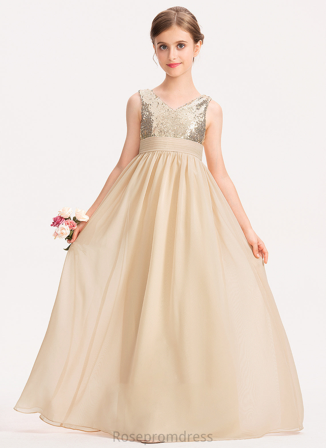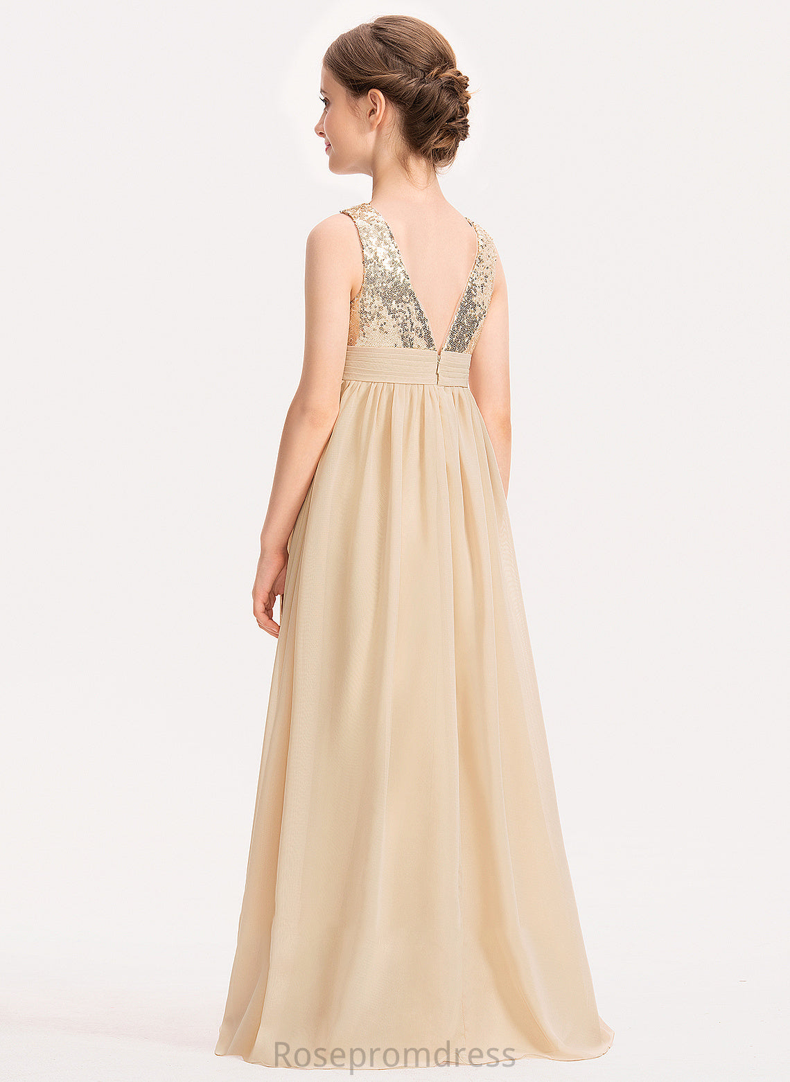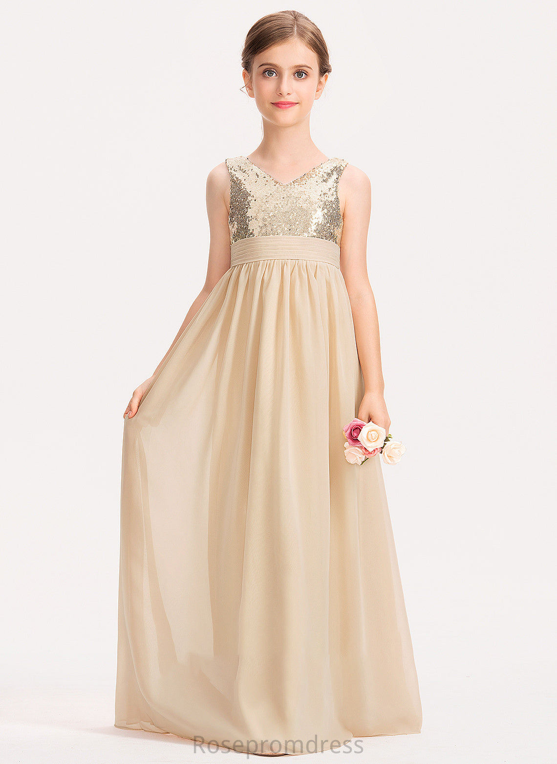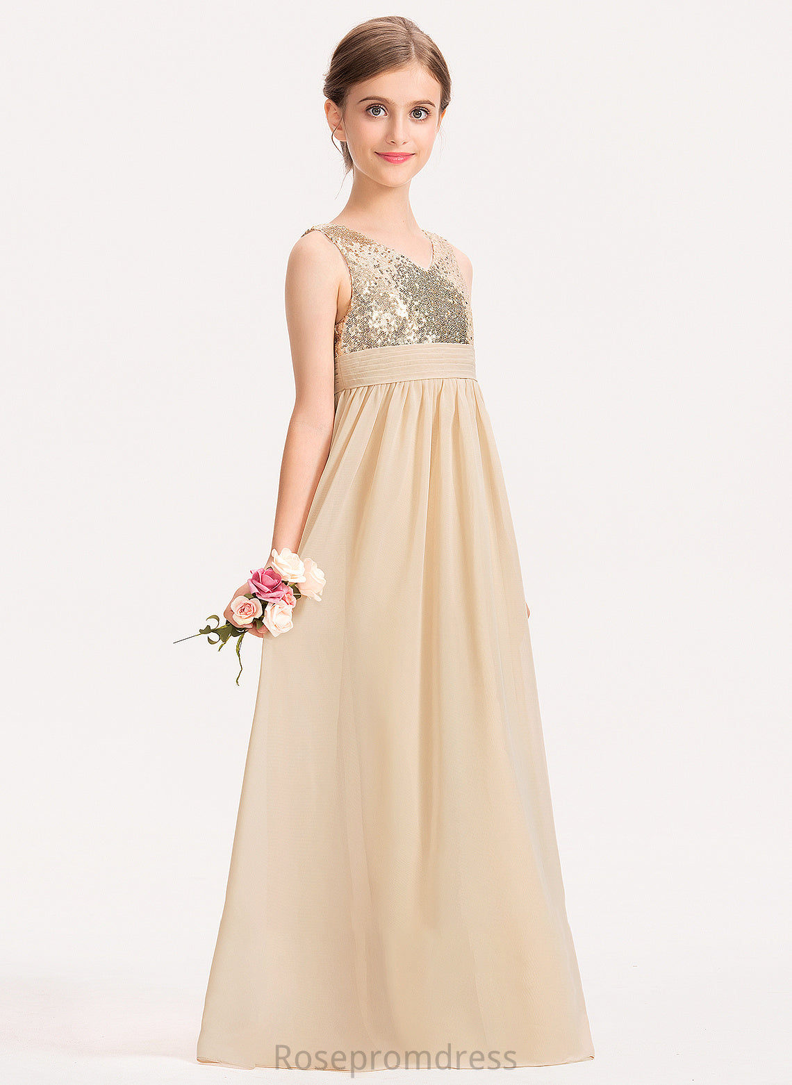 Sequined Chiffon Meg Junior Bridesmaid Dresses V-neck A-Line With Ruffle Floor-Length