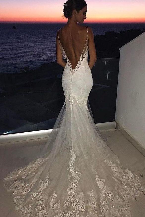 Sexy Mermaid Spaghetti Straps Wedding Dresses Lace Appliques Wedding Gowns with Tulle W1035