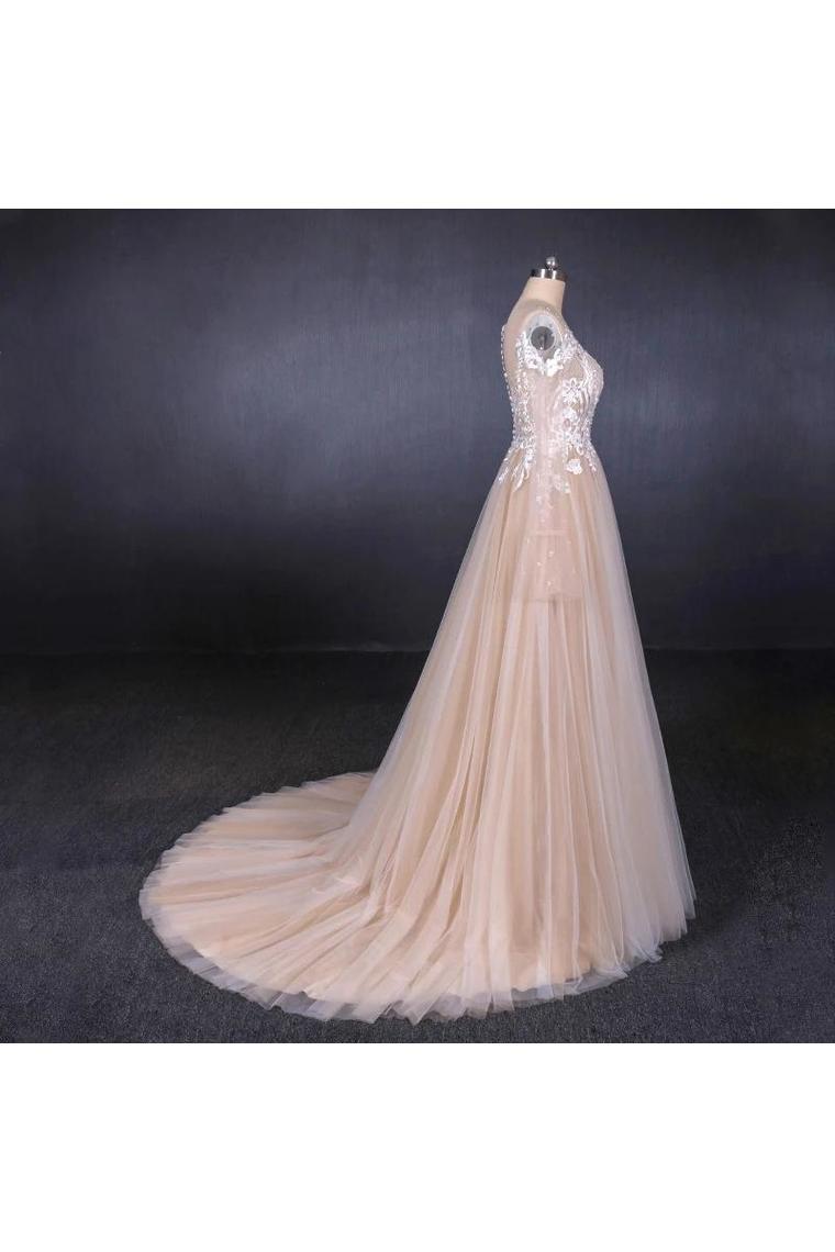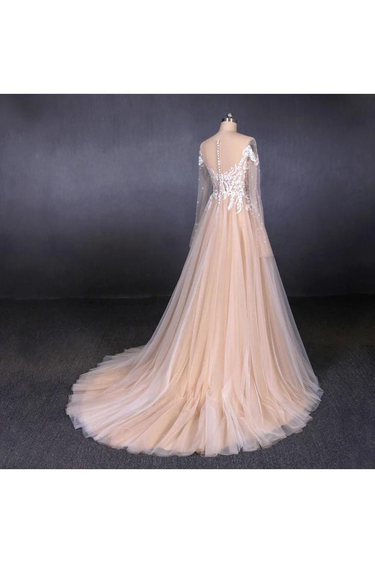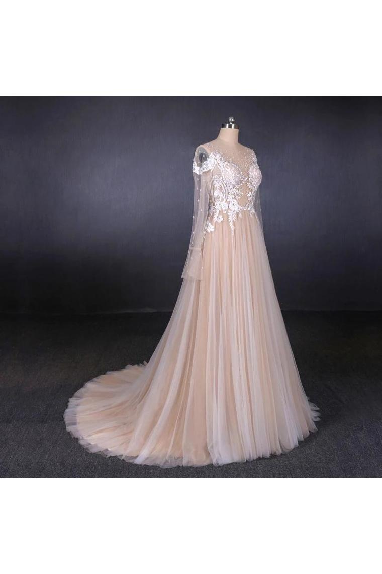 Sexy Sheer Neck Long Sleeves Tulle Wedding Dress, Charming Tulle Bridal Dress With Appliques