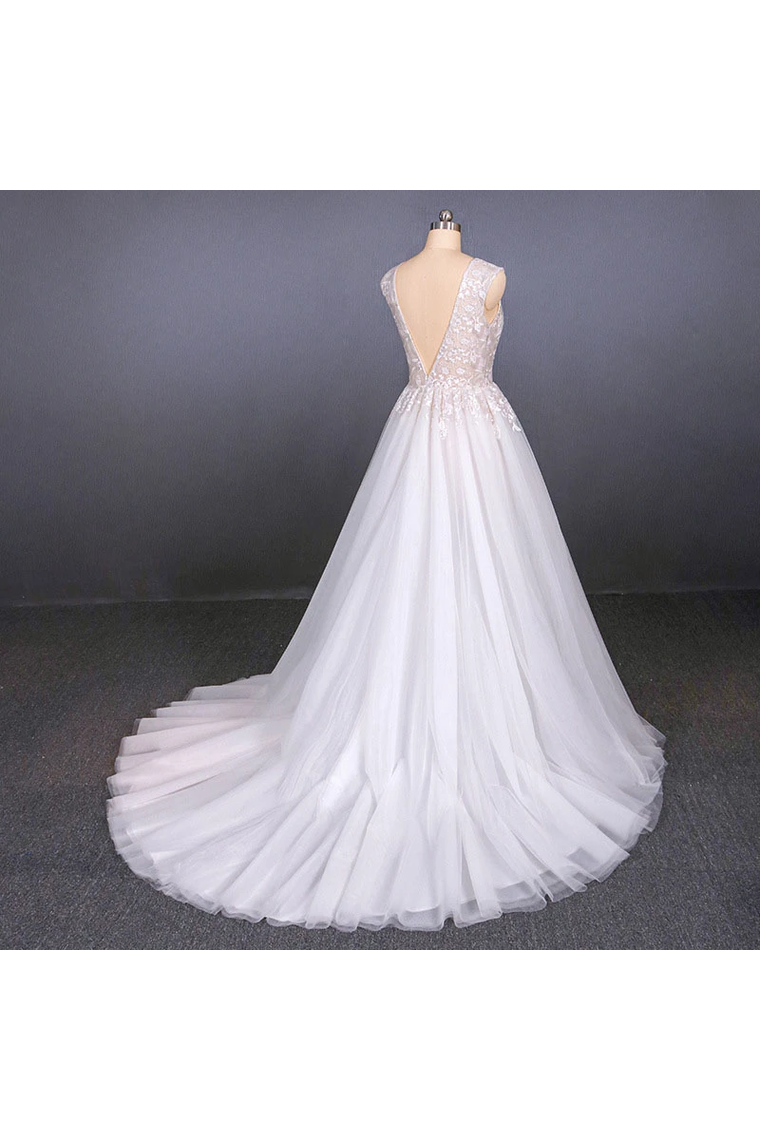 Sexy V Neck Tulle Wedding Dress With Lace Appliques, A Line Backless Bridal Dress