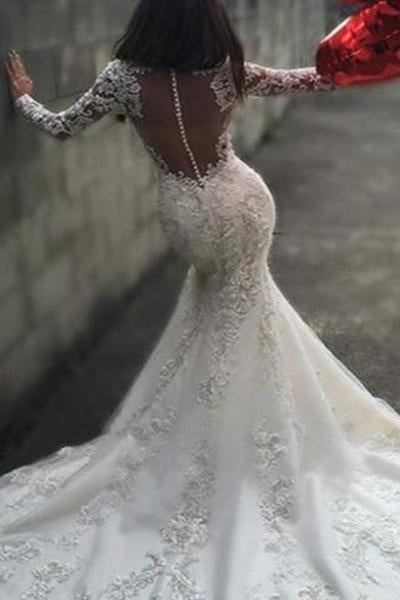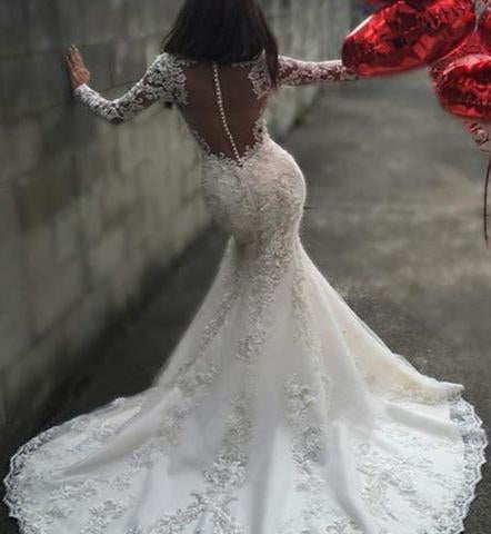 Sexy White Yarn Button Back Long Sleeve Lace Mermaid Charming Chapel Trailing Wedding Dress RS171