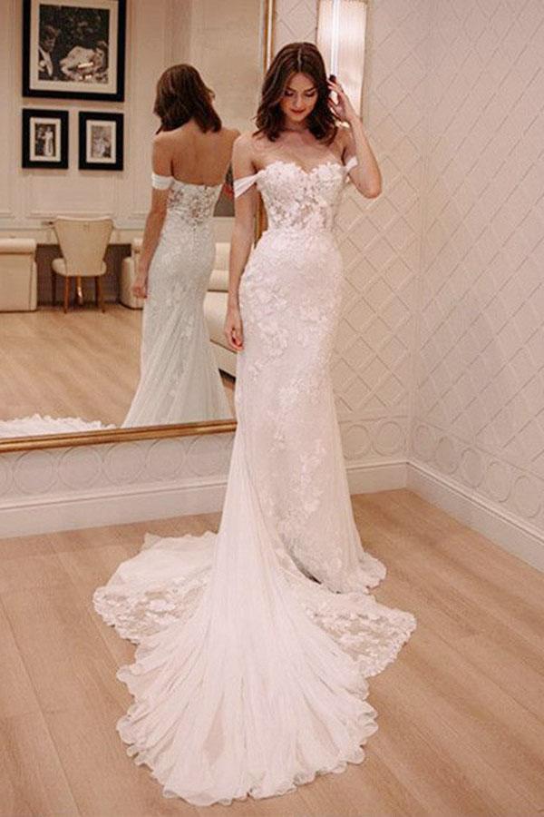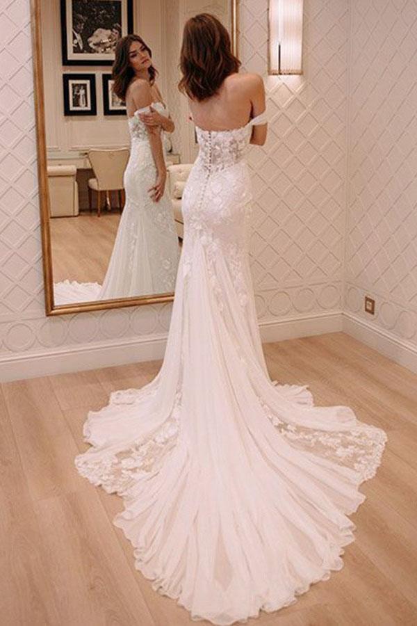 Sheath Off-the-Shoulder White Mermaid Chiffon Lace Appliques Beach Wedding Dresses RS328