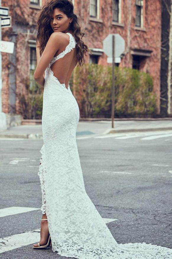 Sheath White Mermaid Round Neck Sweep Train Open Back Lace Wedding Dress with Split RS26