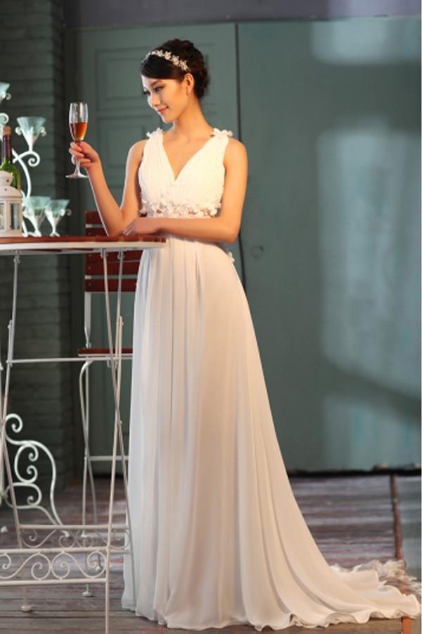 Sheer Back A-Line V-Neck Floor-Length Chiffon Appliques Sleeveless Wedding Dress RS66