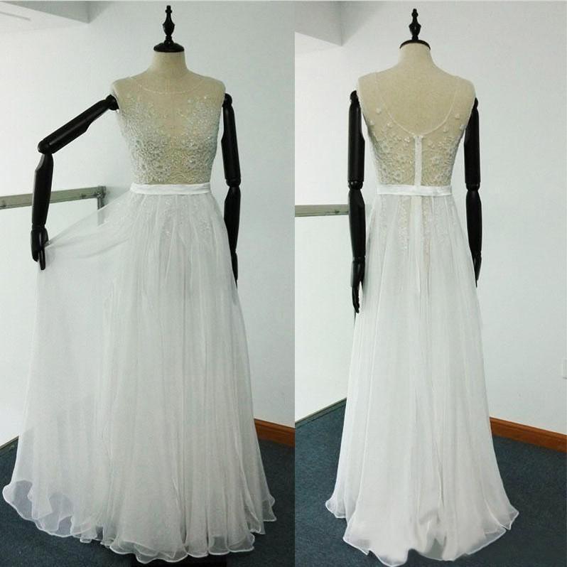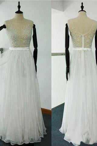 Sheer Beach Ivory Scoop A Line Beaded Embroidery Tulle Chiffon Wedding Dresses RS351