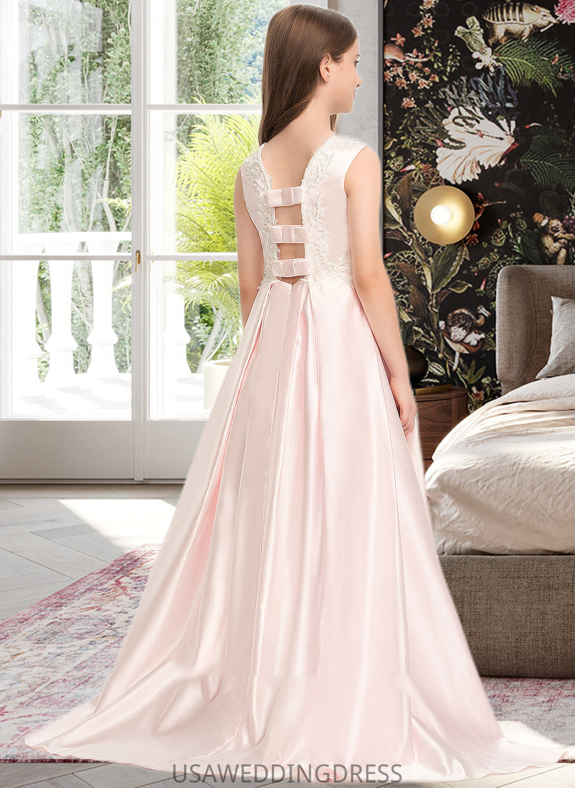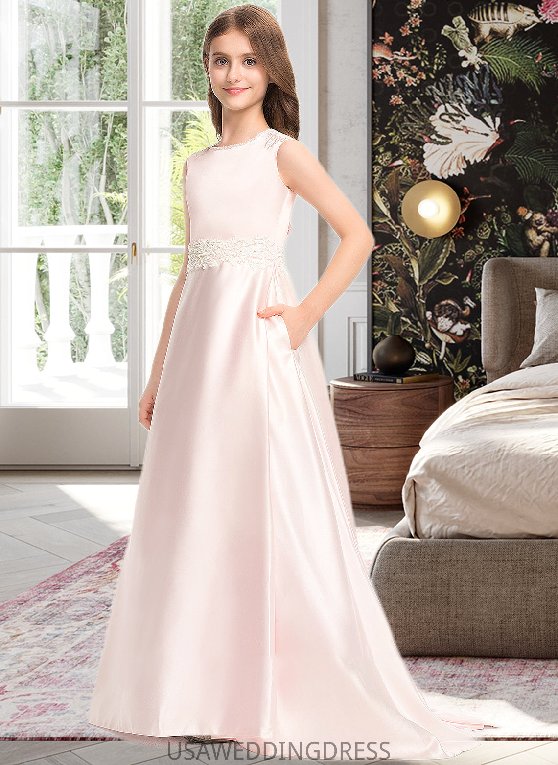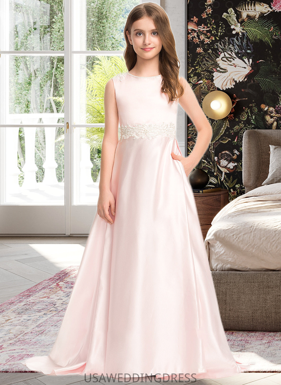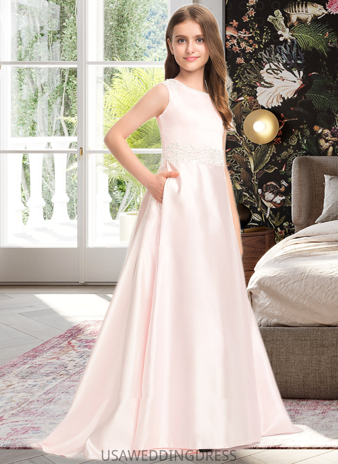 Shiloh A-Line Scoop Neck Sweep Train Satin Lace Junior Bridesmaid Dress With Bow(s) Pockets DSP0013609