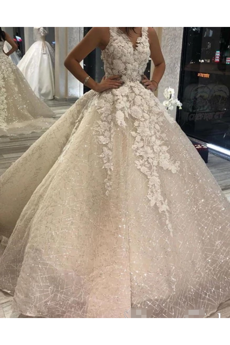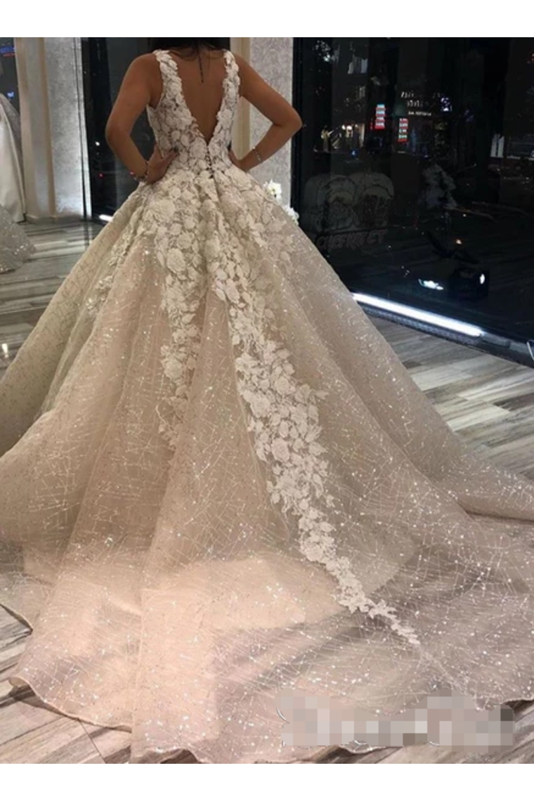 Shimmer Organza Ball Gown Wedding Dress With V Neck And Sequins Decorated