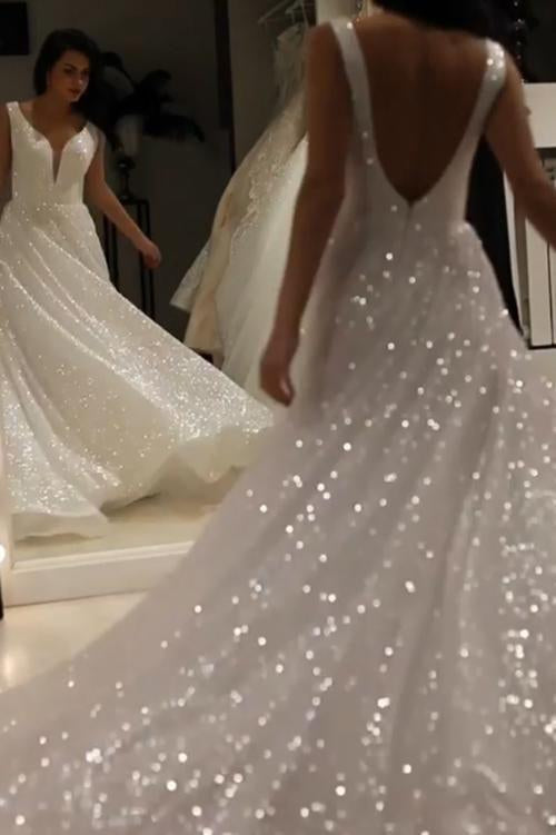 Shiny Ivory Sequins V Neck Backless Straps Wedding Dresses, Beach Bridal Dresses SRS15375