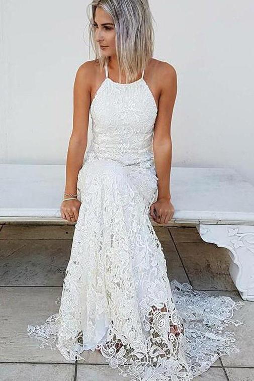 Simple Halter Mermaid Lace Appliques Wedding Dress Backless Beach Bridal Gowns JS937