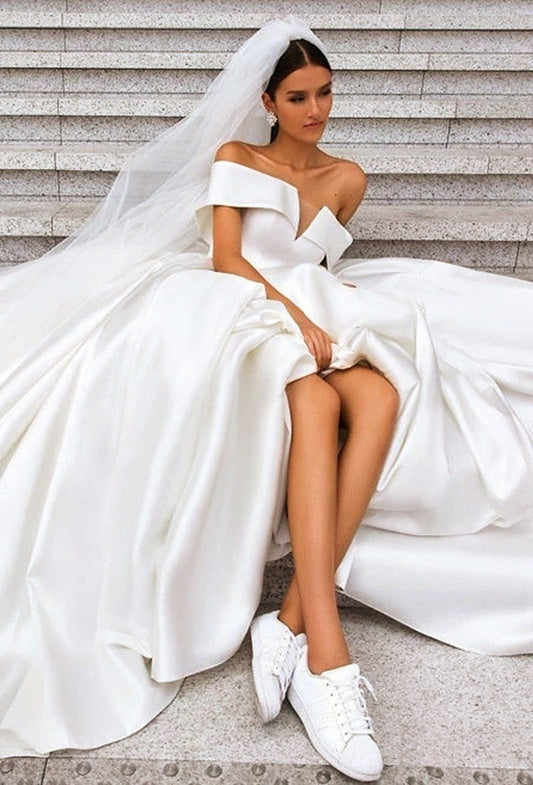 Simple Off The Shoulder Ivory Satin Wedding Dresses Lace Up Wedding Gowns