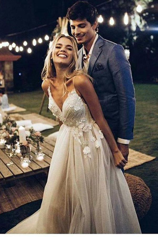 Simple Spaghetti Straps Tulle Sleeveless Appliques Wedding Dresses