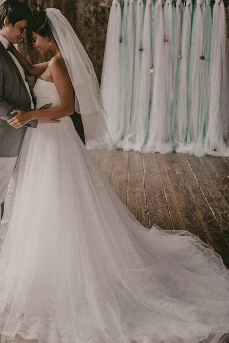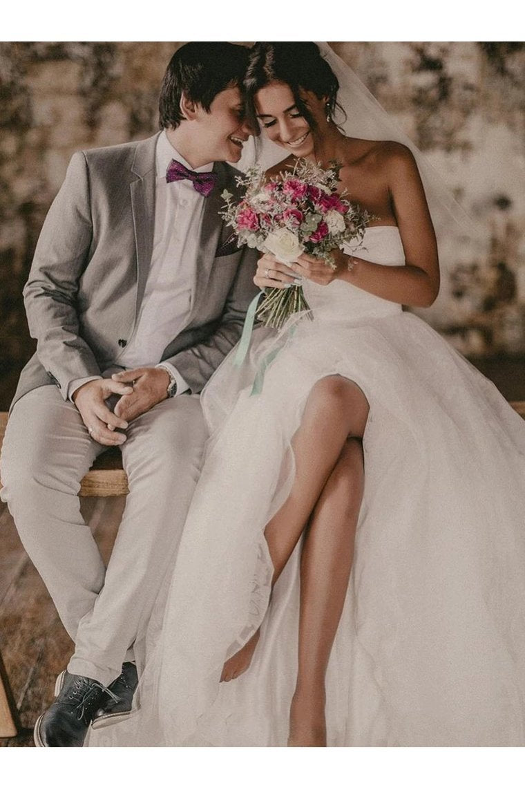 Simple Strapless Tulle Lace Wedding Dress Beach Bridal Gown With Slit