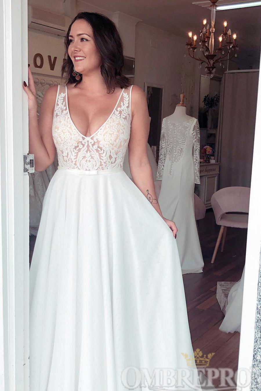 Simple V Neck Sleeveless A Line Lace Wedding Dresses