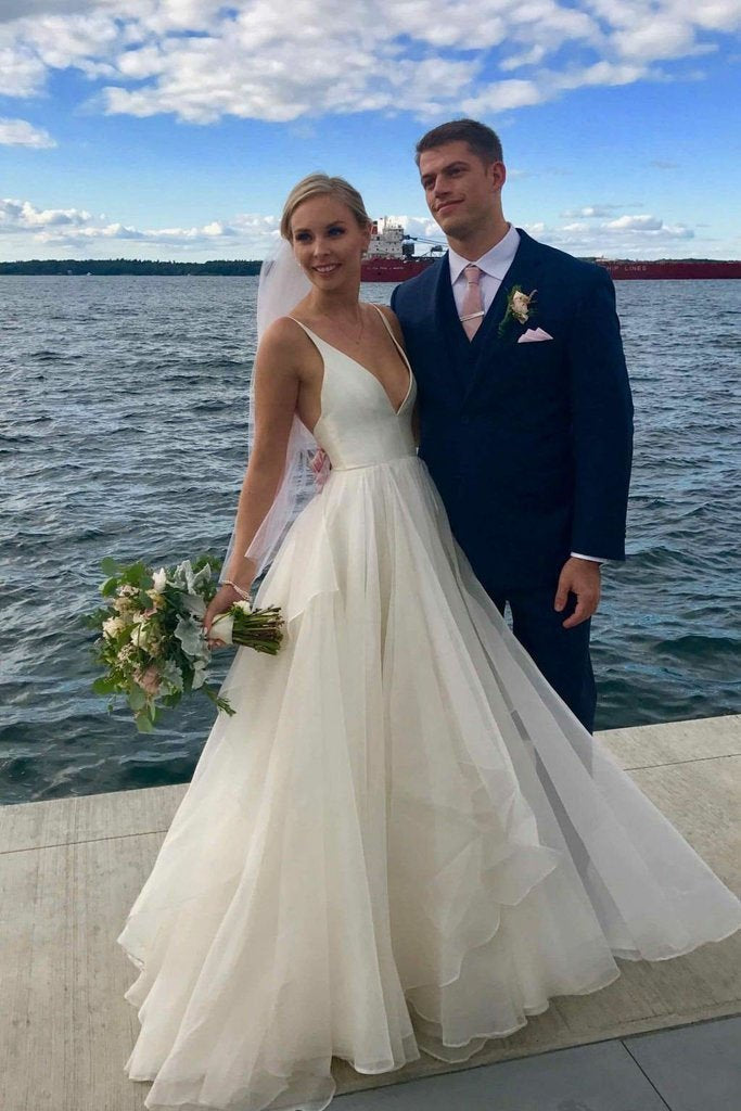 Simple V Neckline Spaghetti Strap Backless Ivory A Line Cheap Beach Wedding Dresses W1015