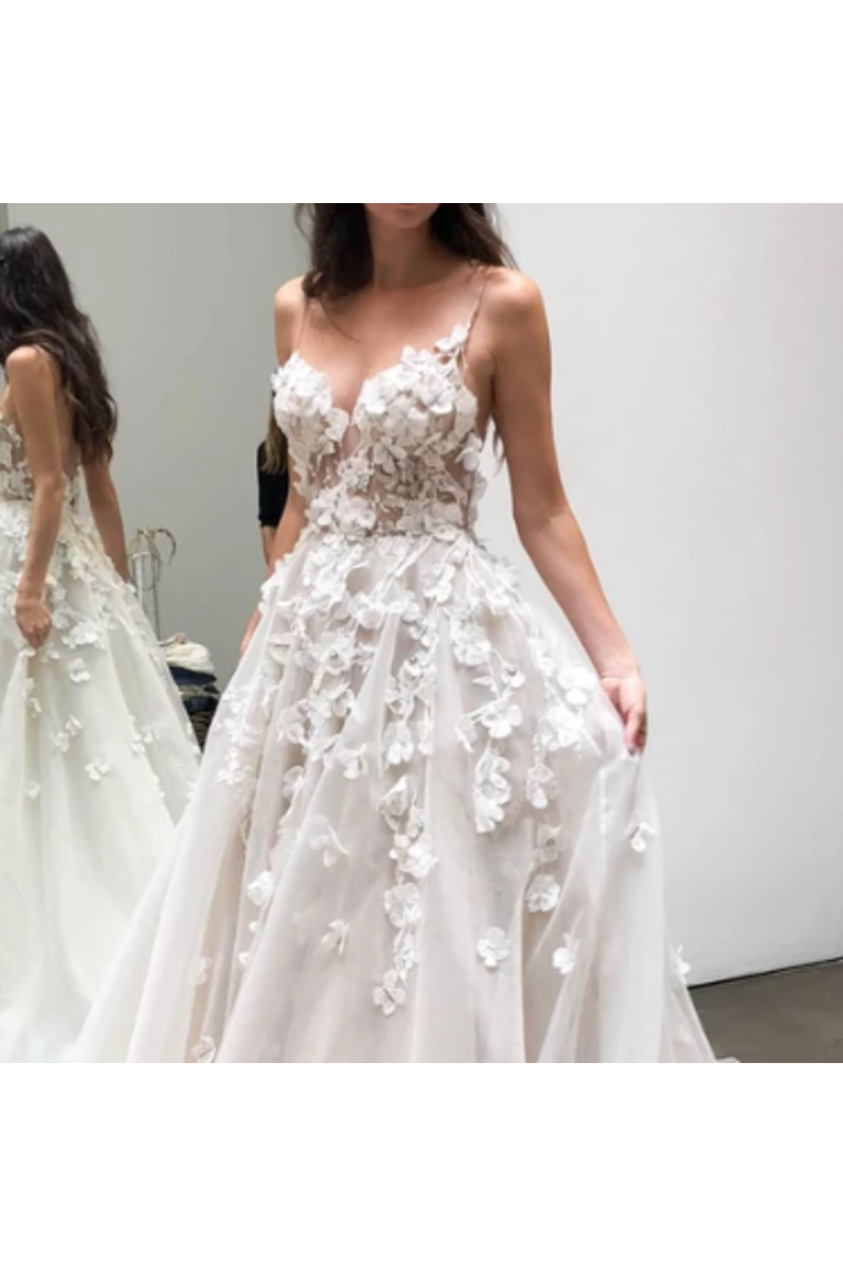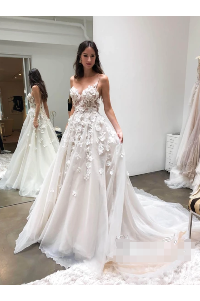 Spaghetti Strap Sweetheart Neck Beach Wedding Dresses 30D Appliqued Bridal Dresses
