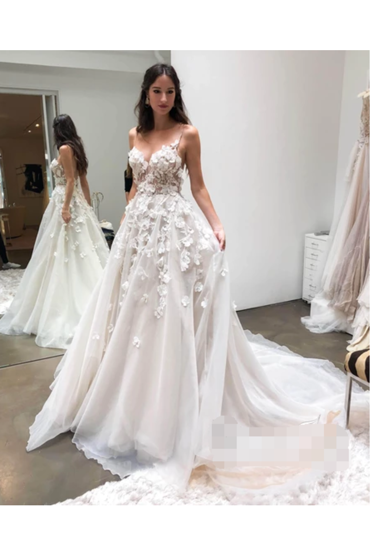 Spaghetti Strap Sweetheart Neck Beach Wedding Dresses 3D Appliqued Bridal Dresses