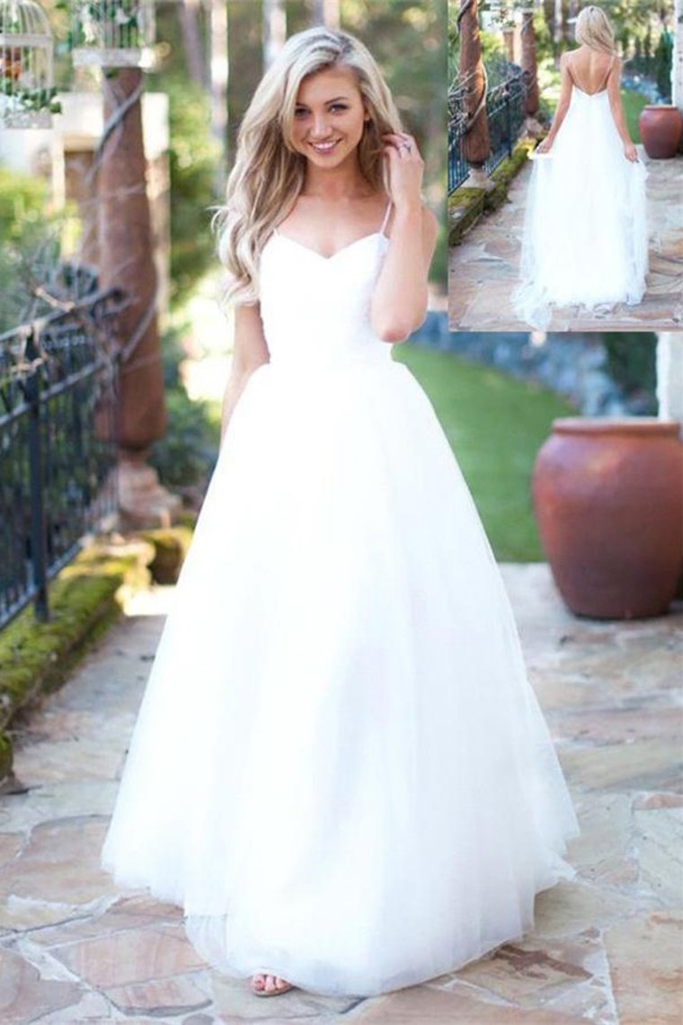 Spaghetti Straps Long Simple Elegant White Open Back Wedding Dresses