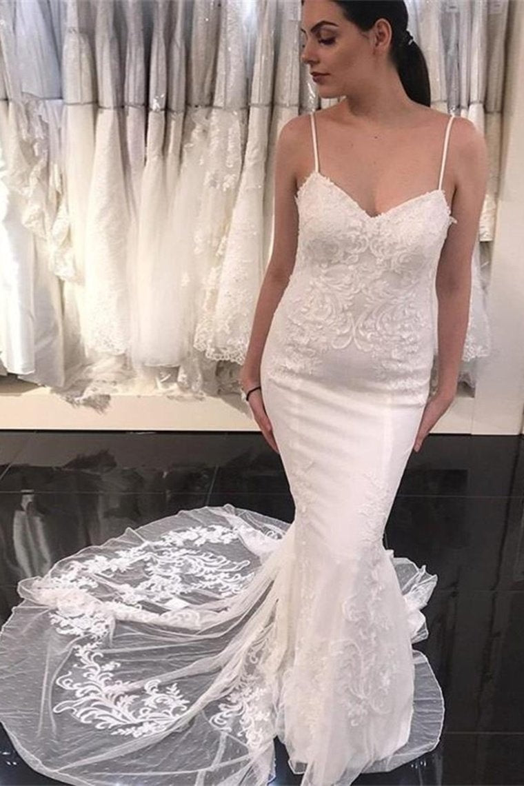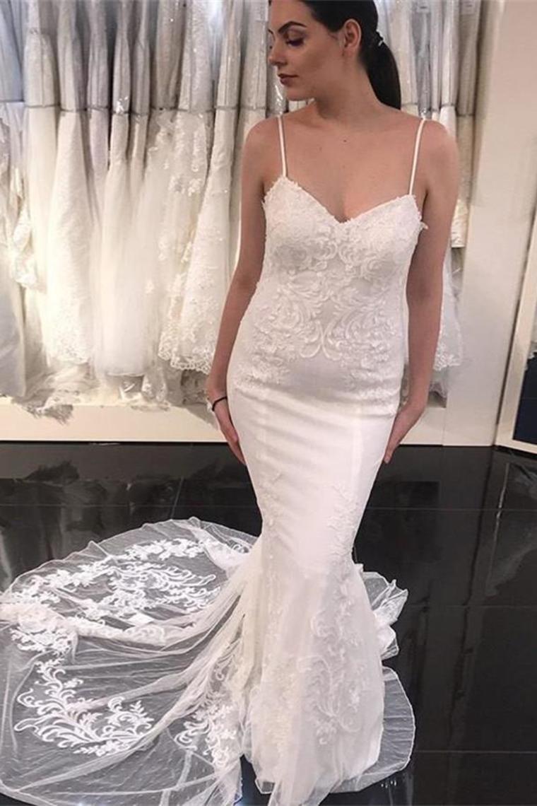 Spaghetti Straps Sheath Classy Ivory Lace Long Wedding Dresses