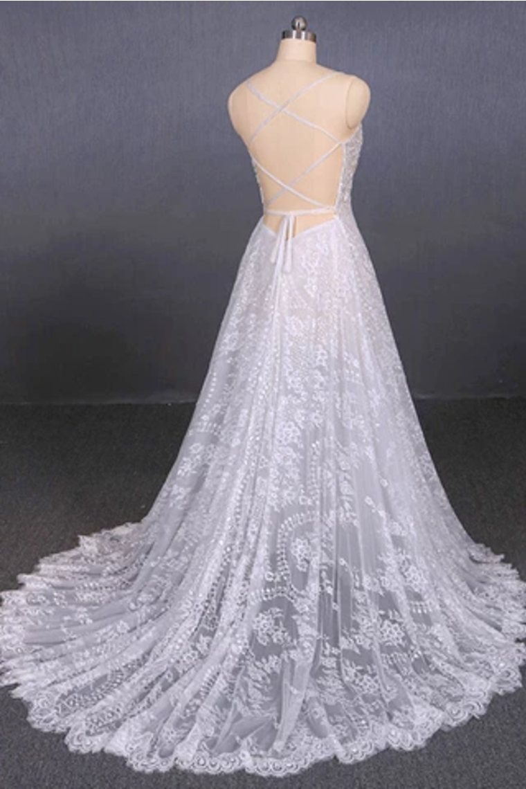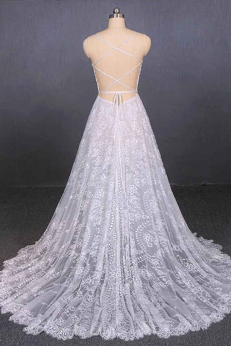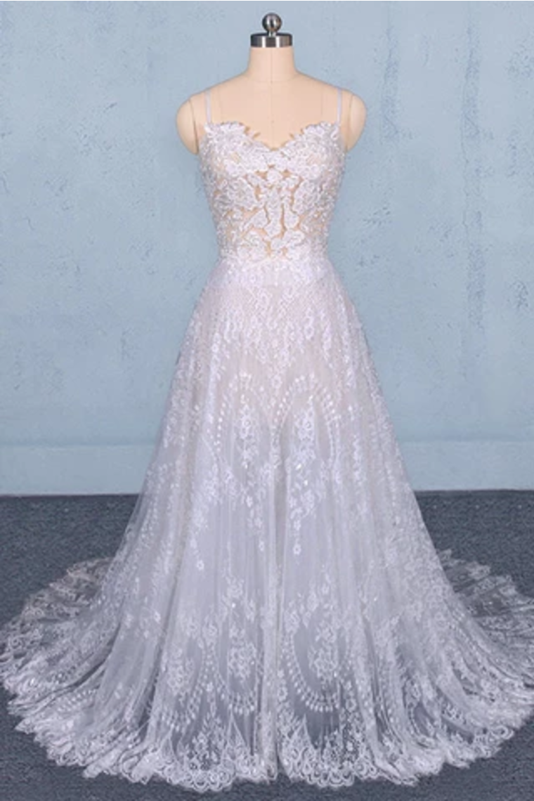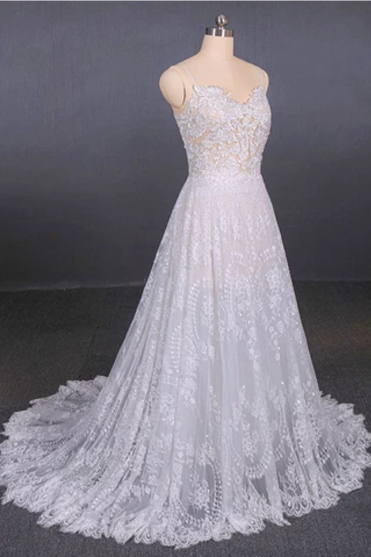 Spaghetti Straps Sweetheart Lace Wedding Dresses, Lace Bridal Dresses With Long Train
