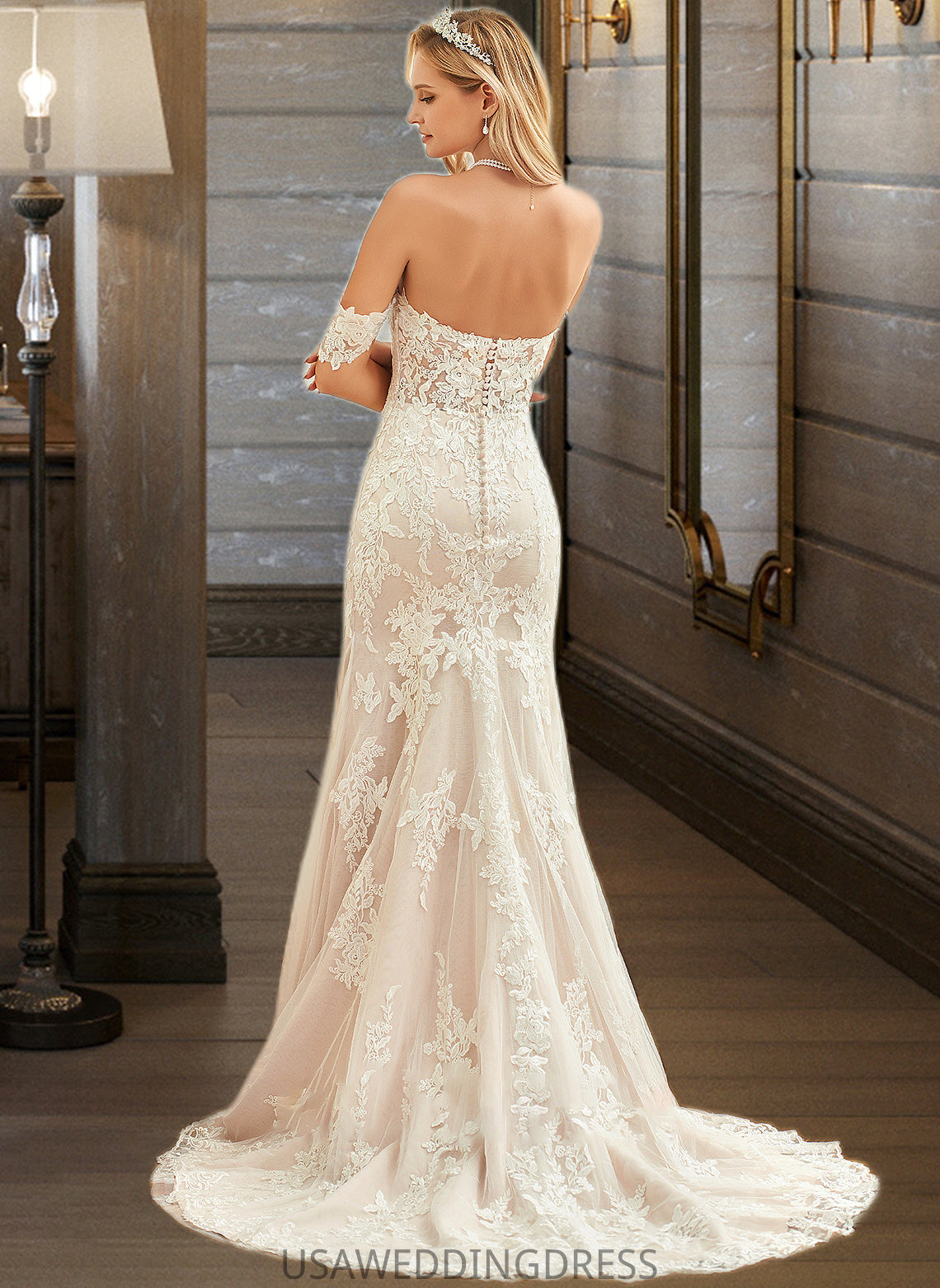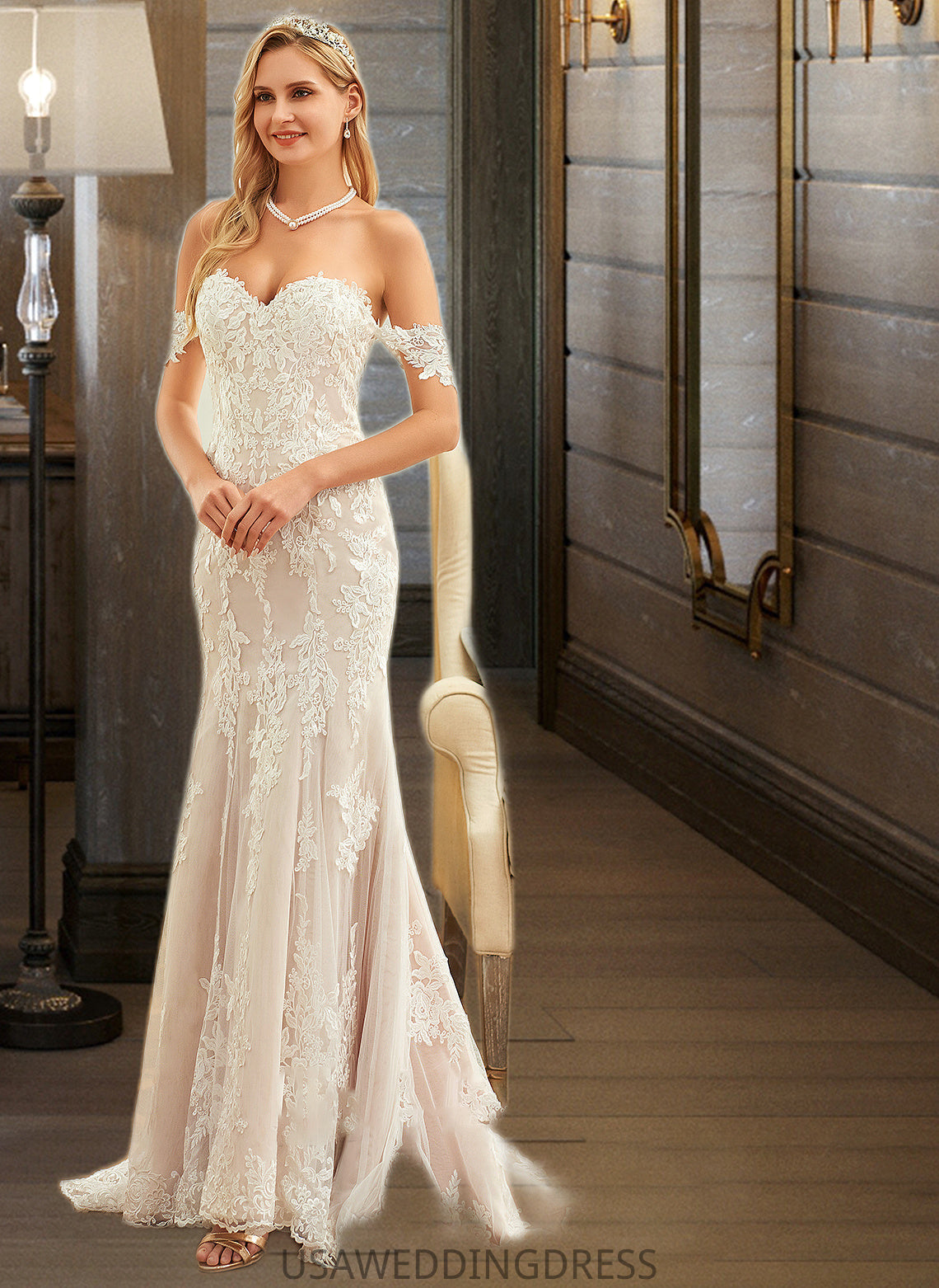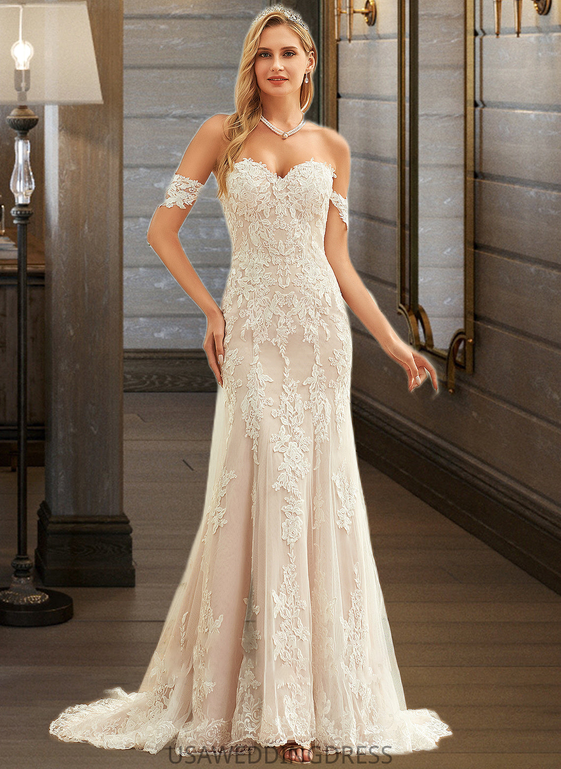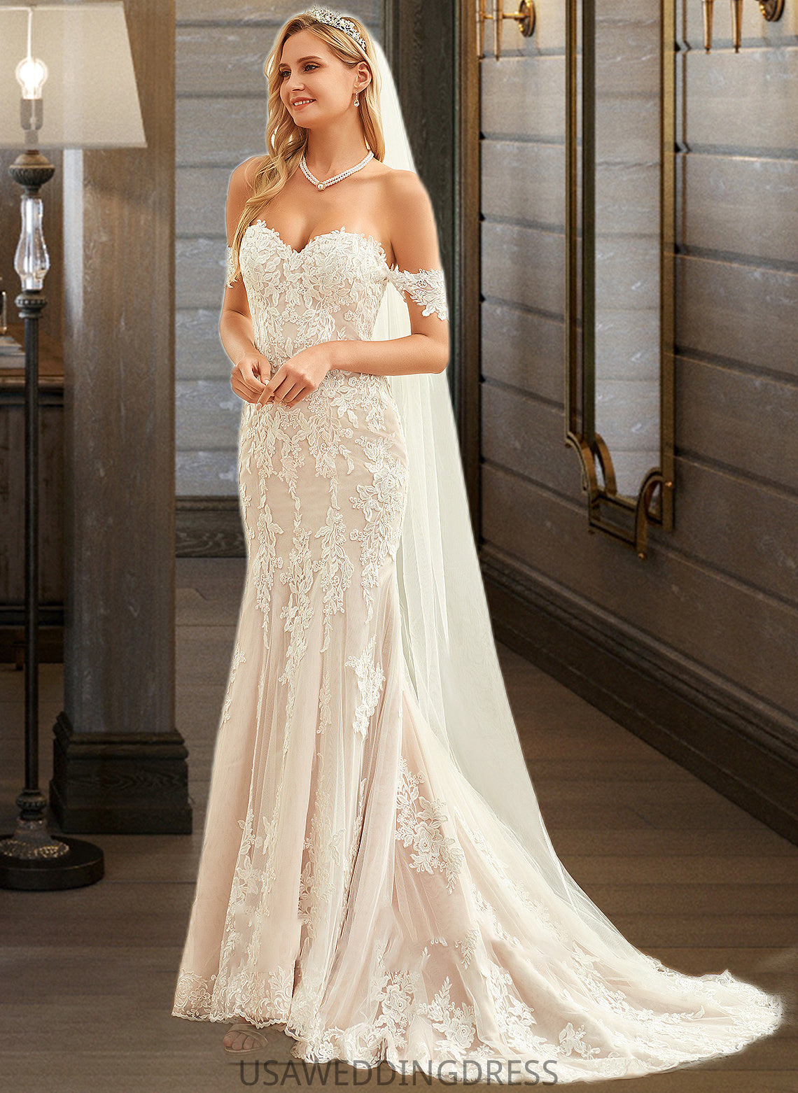 Stephanie Trumpet/Mermaid Off-the-Shoulder Court Train Tulle Lace Wedding Dress DSP0013789