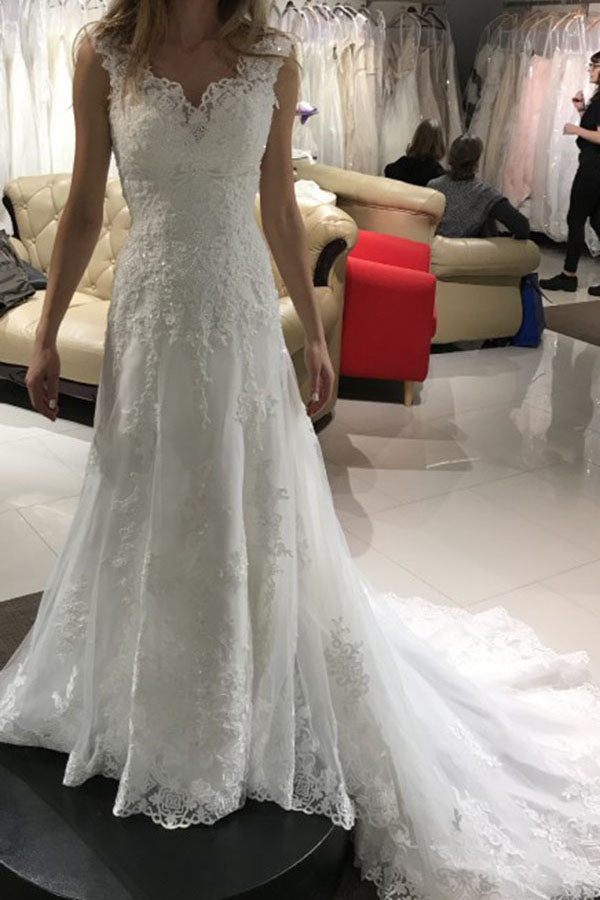 Stunning Sleeveless V Neck Sweep Train Lace Wedding Dresses