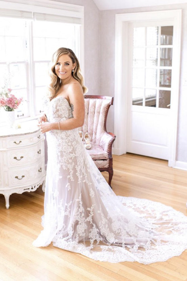 Sweetheart Strapless Sweep Train Mid Back Appliques Wedding Dresses