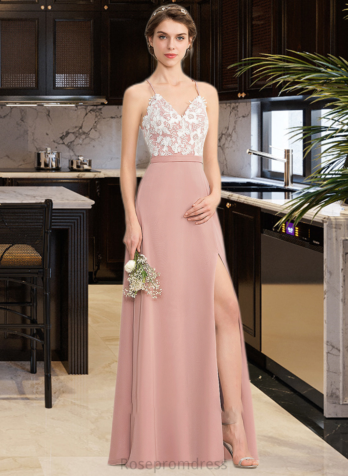 Sylvia A-Line V-neck Floor-Length Chiffon Lace Bridesmaid Dress With Split Front SRSP0013045