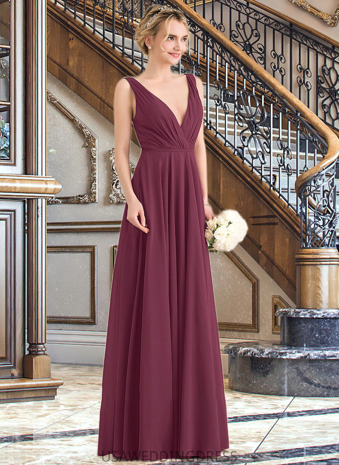 Taliyah A-Line V-neck Floor-Length Chiffon Bridesmaid Dress With Ruffle DSP0012789