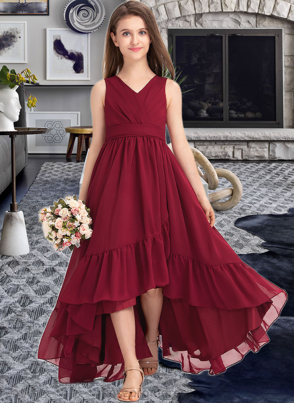 Tamara A-Line V-neck Asymmetrical Chiffon Junior Bridesmaid Dress With Bow(s) Cascading Ruffles SRSP0013310