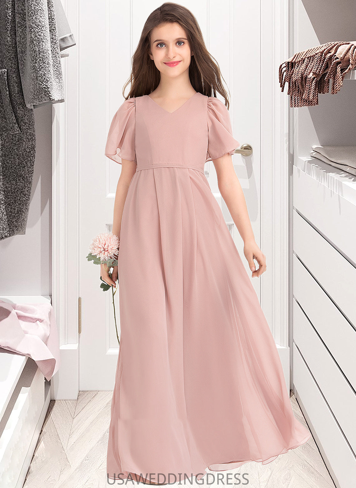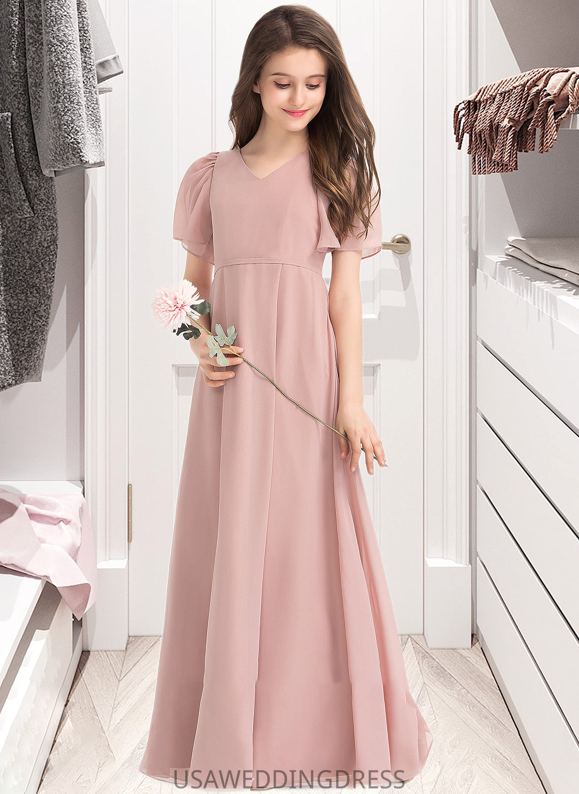Teresa A-Line V-neck Floor-Length Chiffon Junior Bridesmaid Dress With Bow(s) DSP0013399