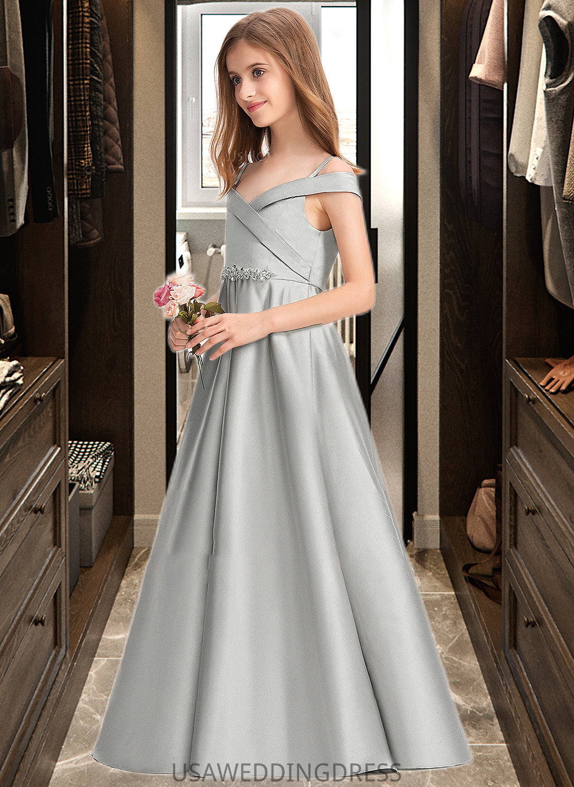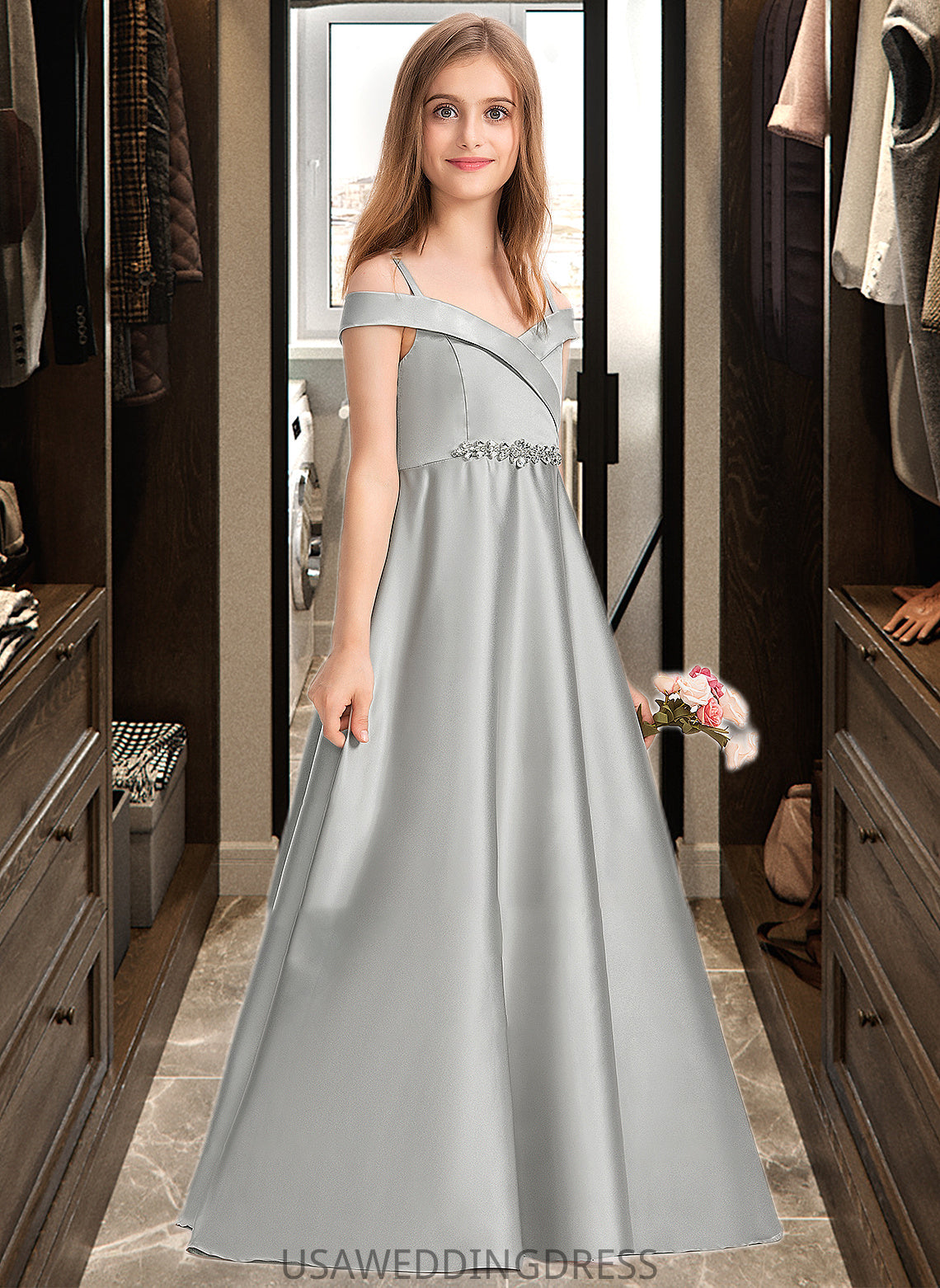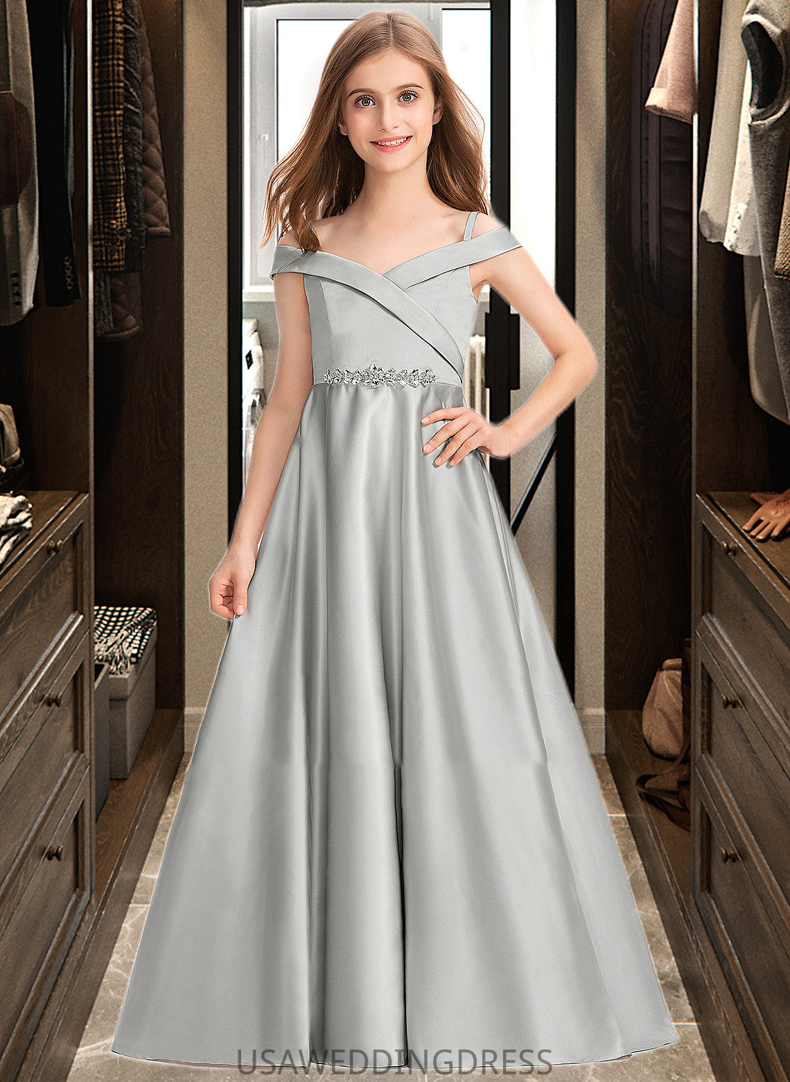 Thea Ball-Gown/Princess Off-the-Shoulder Floor-Length Satin Junior Bridesmaid Dress DSP0013404