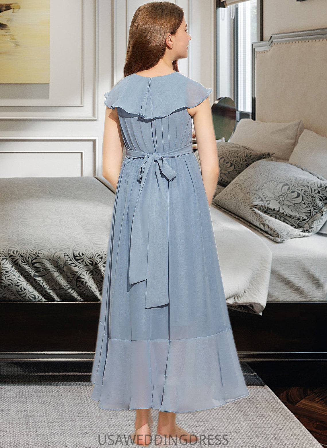 Tori A-Line V-neck Asymmetrical Chiffon Junior Bridesmaid Dress With Bow(s) Cascading Ruffles DSP0013522