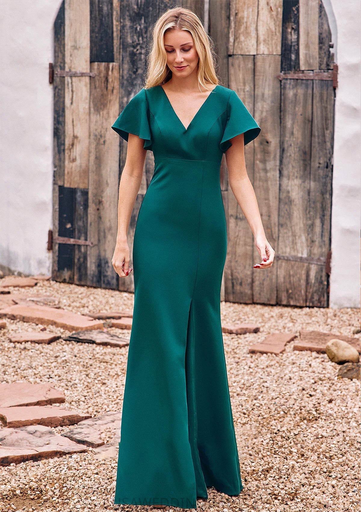 Trumpet/Mermaid V Neck Short Sleeve Stretch Crepe Floor-Length Bridesmaid Dresses with Split Danielle DSP0025273