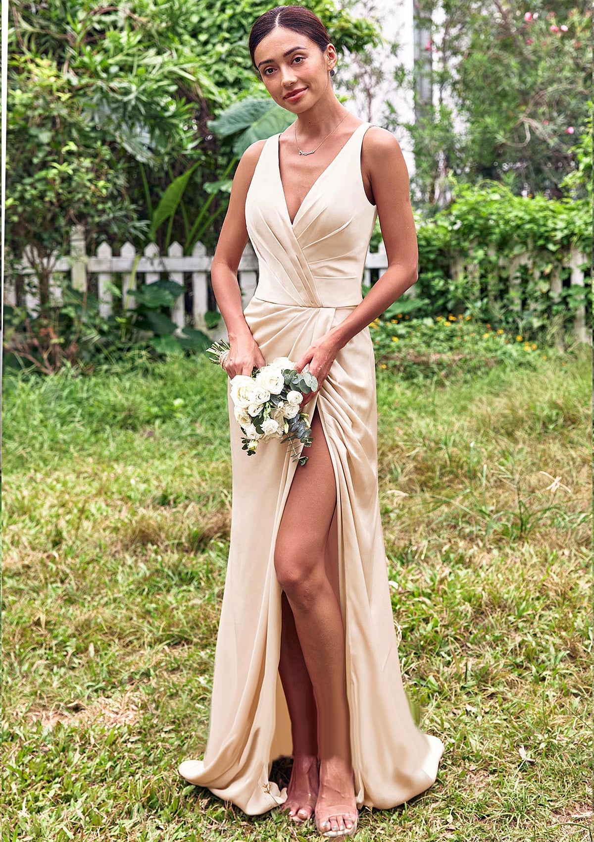 Trumpet/Mermaid V Neck Sleeveless Floor-Length Stretch Satin Bridesmaid Dresses with Pleated Split Isabela DSP0025255