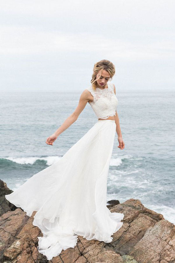 Two Piece A Line Brush Train Sleeveless Lace Chiffon Beach Wedding Dresses