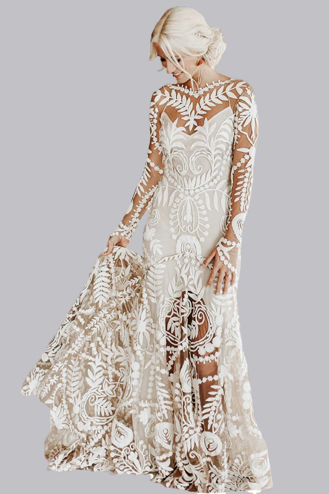 Unique Long Sleeves V Back Boho Beach Rustic Lace Wedding Dresses