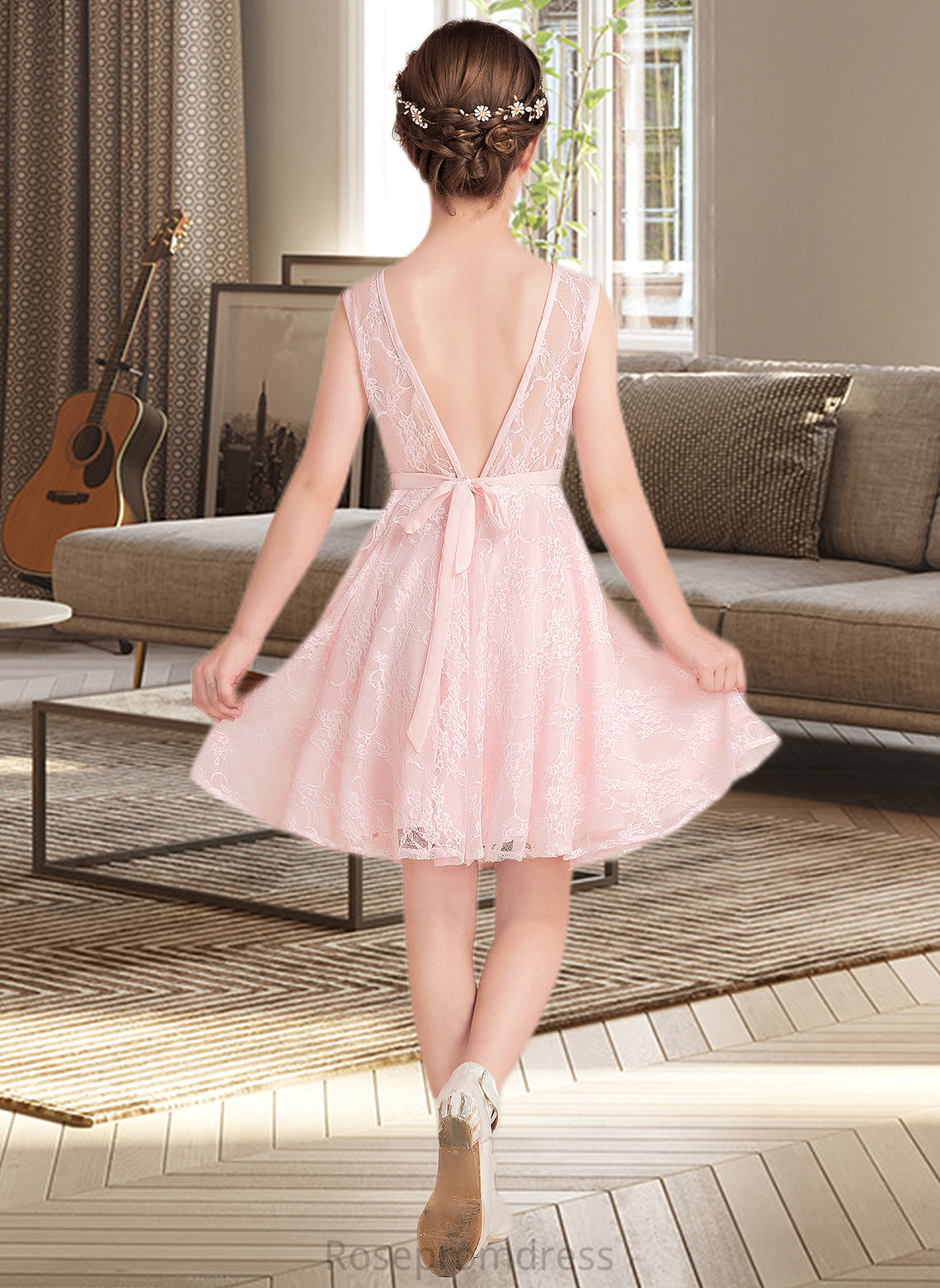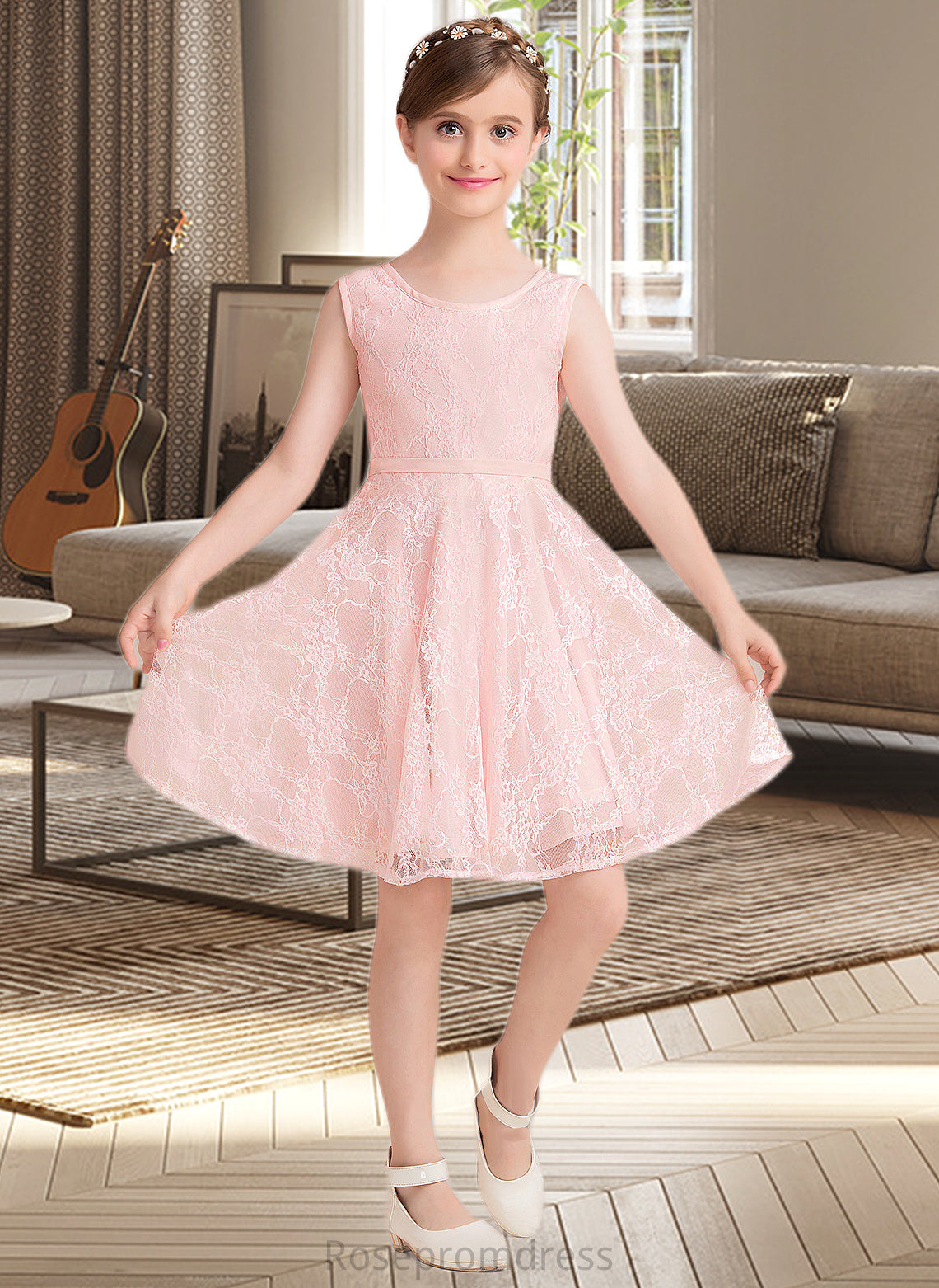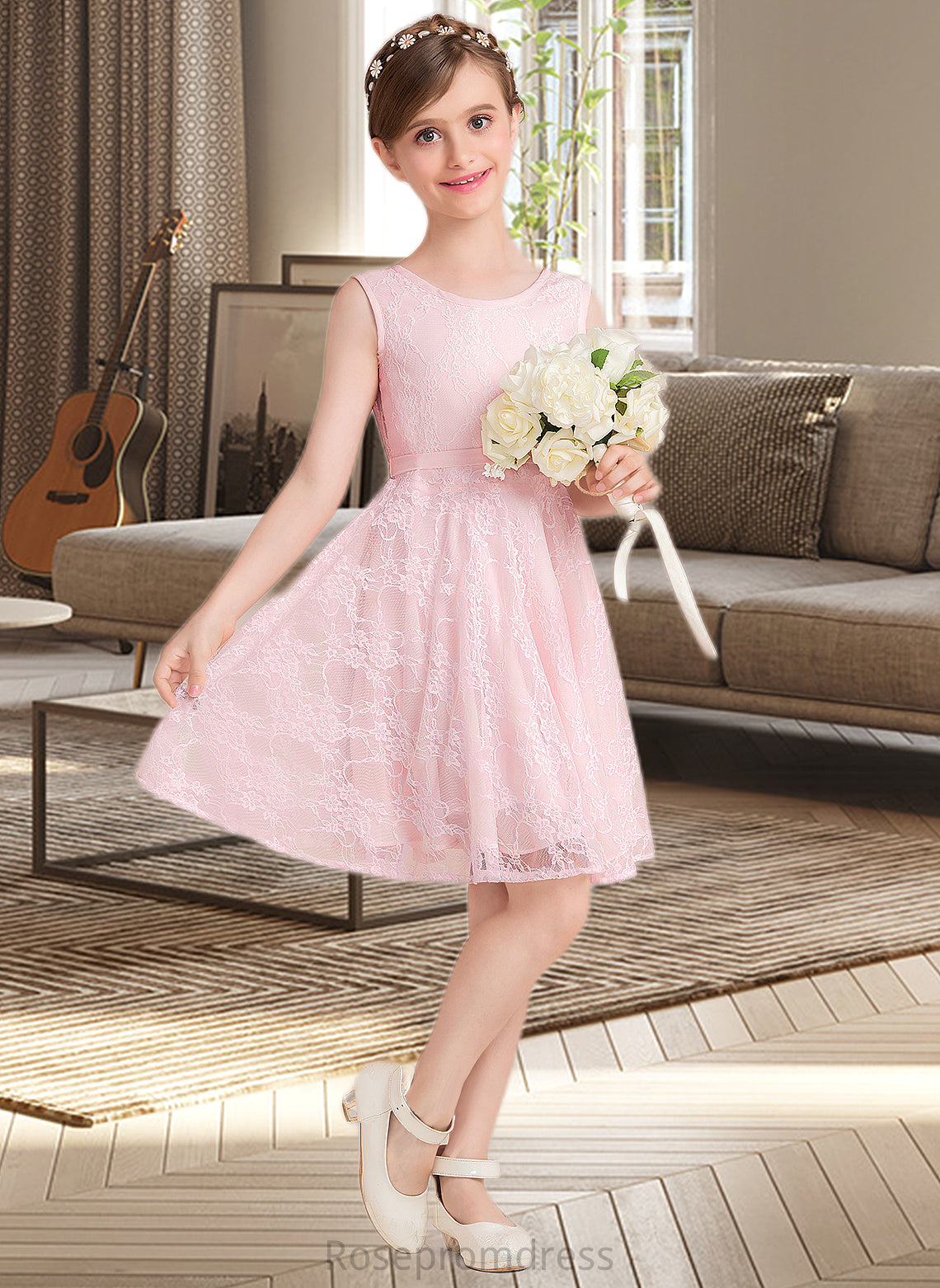 Urania A-Line Scoop Neck Knee-Length Lace Junior Bridesmaid Dress With Sash Bow(s) SRSP0013563