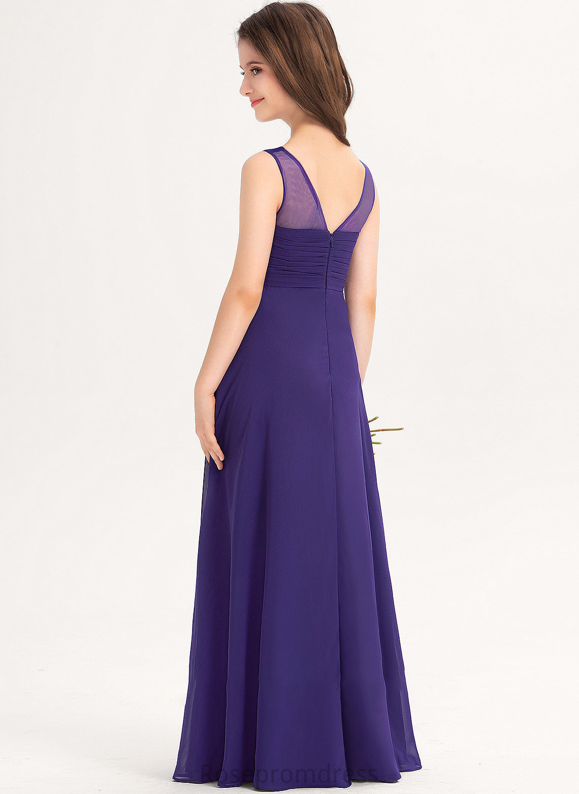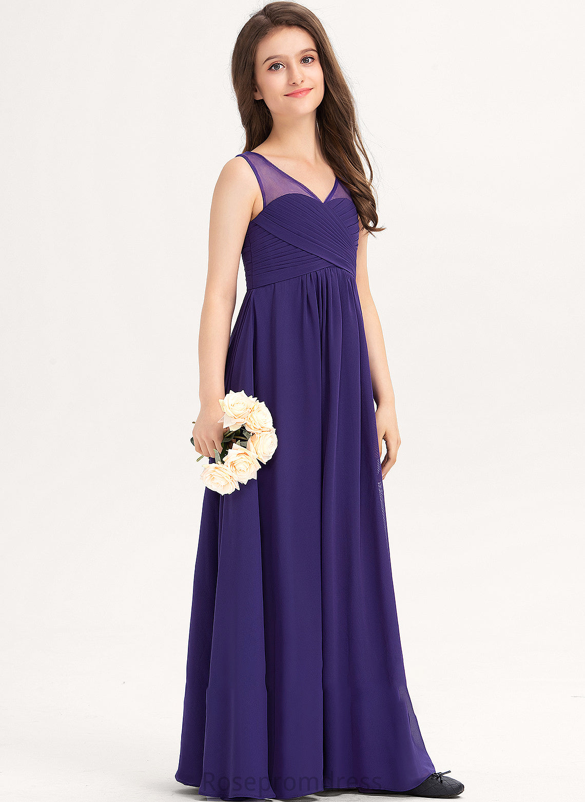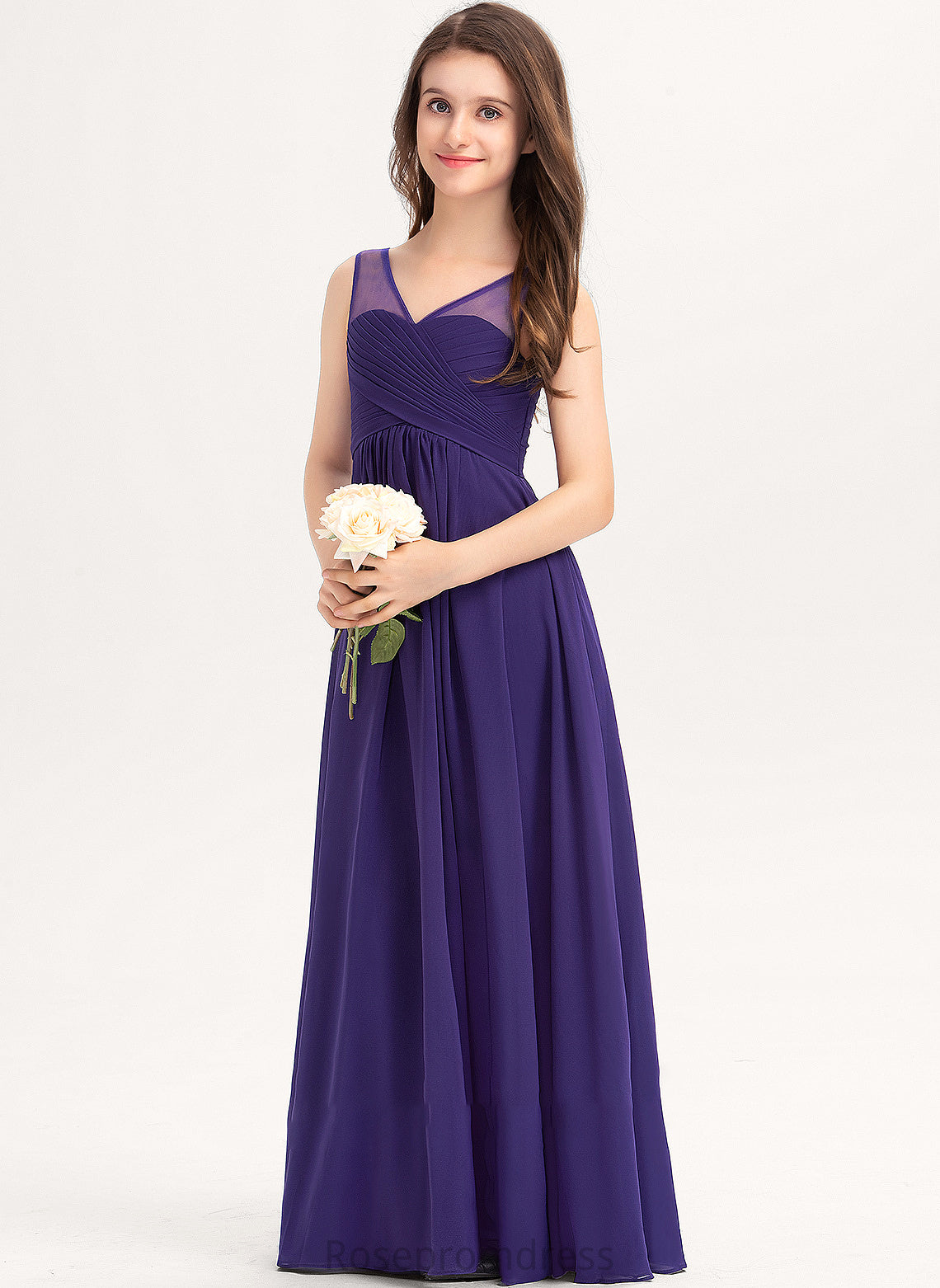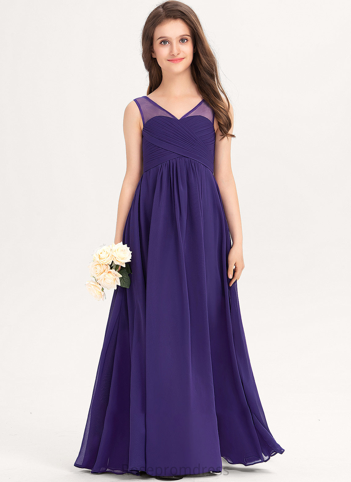 V-neck A-Line Floor-Length Ruffle Chiffon Azaria Junior Bridesmaid Dresses With