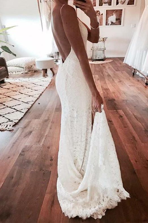 V Neck Spaghetti Straps Backless Lace Boho Wedding Dress With Split Mermaid Bridal Dress JS999