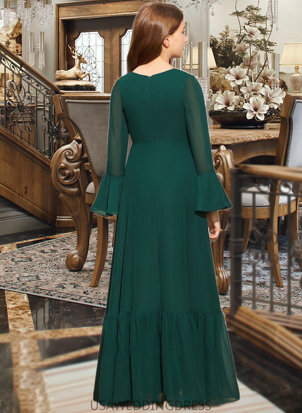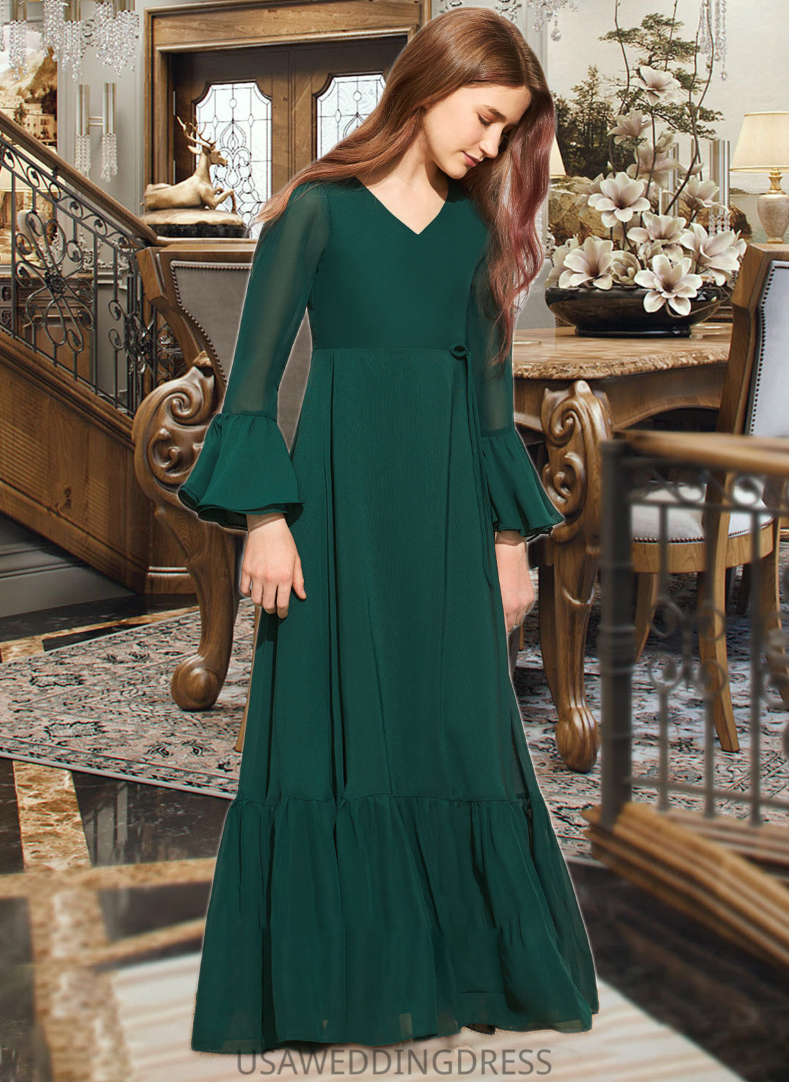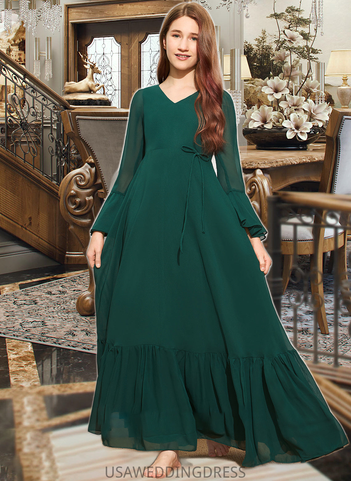 Vicky A-Line V-neck Floor-Length Chiffon Junior Bridesmaid Dress With Bow(s) Cascading Ruffles DSP0013484