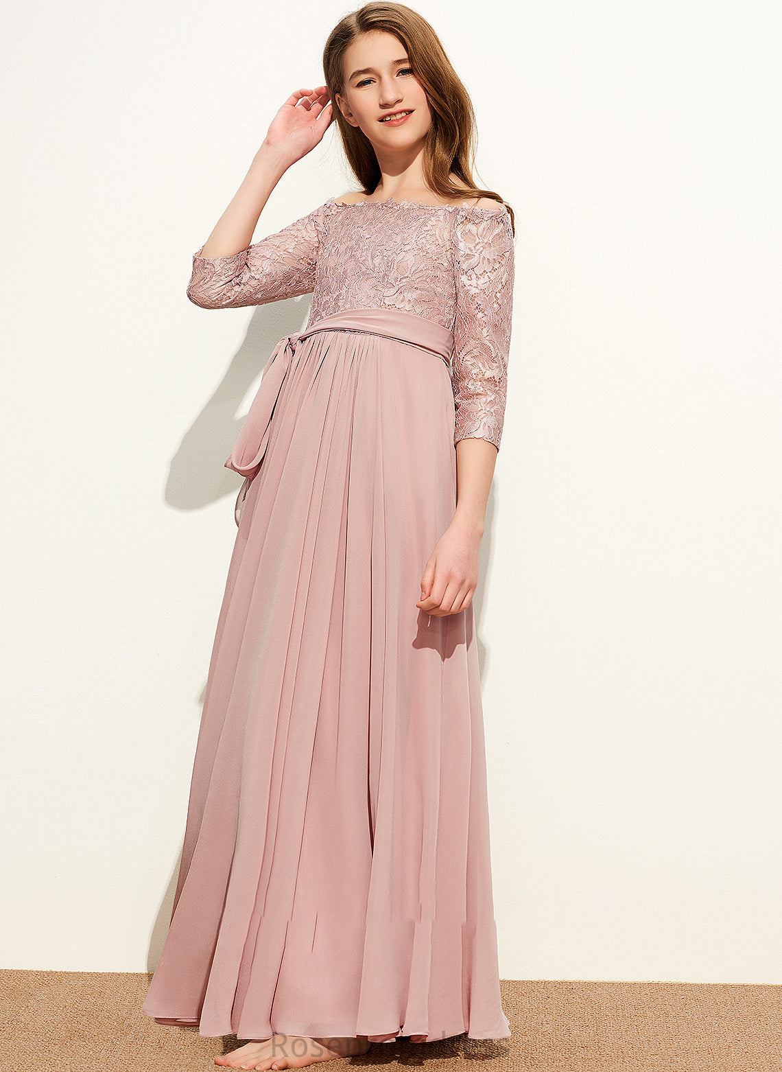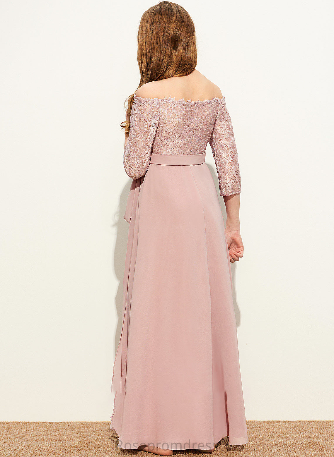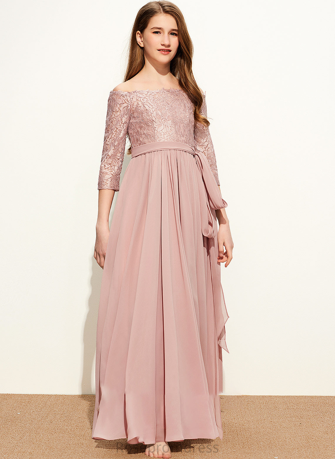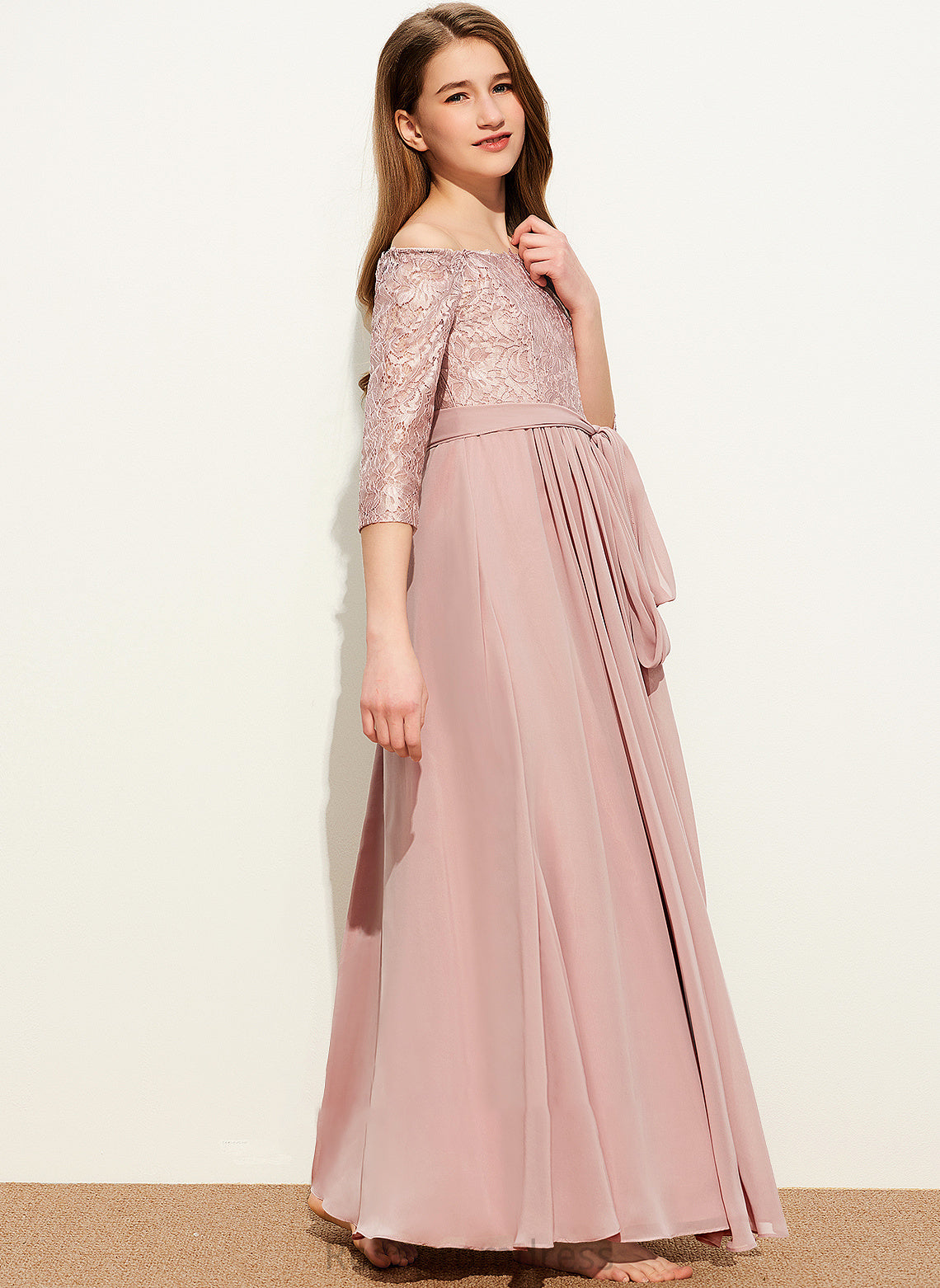 With A-Line Floor-Length Corinne Junior Bridesmaid Dresses Chiffon Lace Off-the-Shoulder Bow(s)
