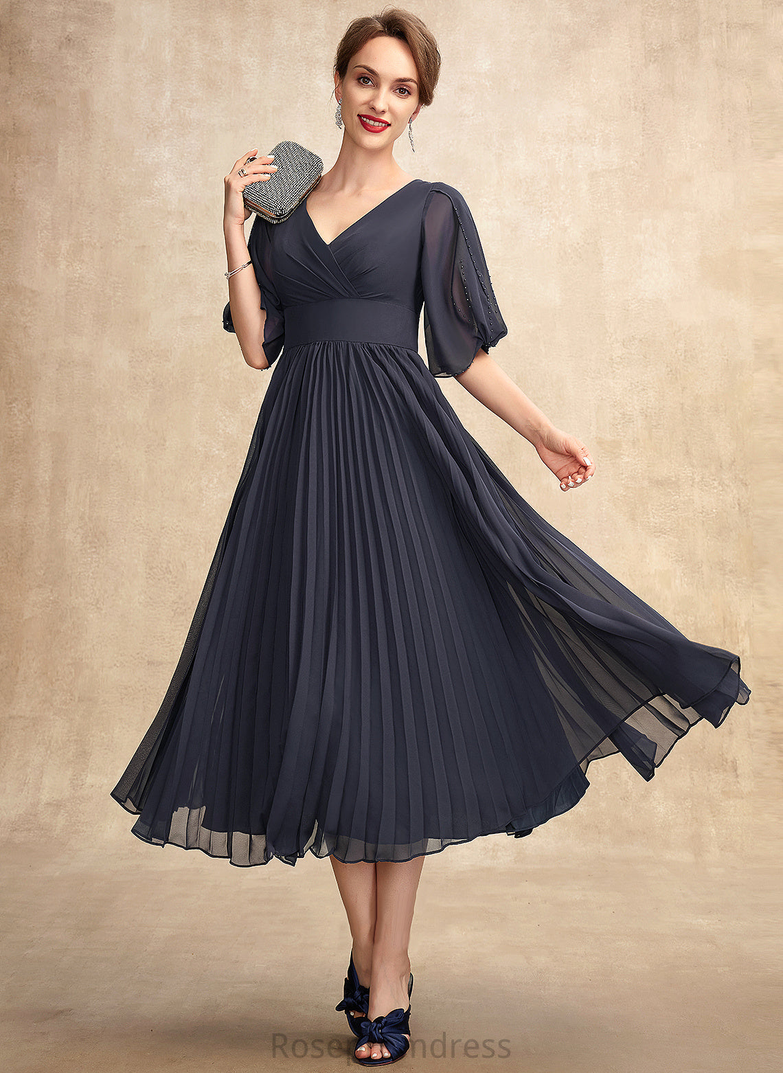 With of A-Line Mother of the Bride Dresses the V-neck Bride Chiffon Pleated Adelyn Tea-Length Dress Mother